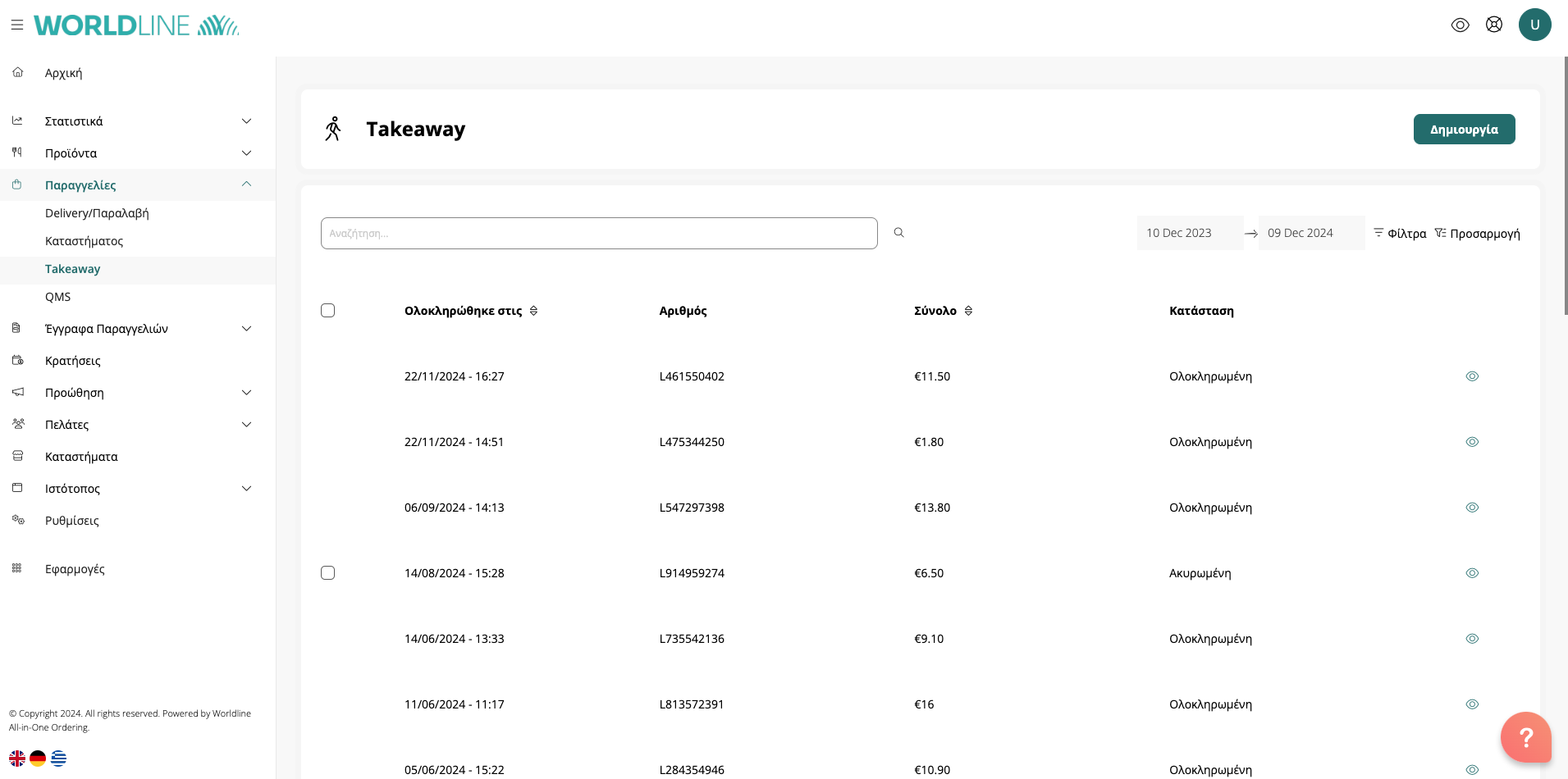 Παραγγελίες Takeaway. Οι παραγγελίες που μπορούν να παραλάβουν οι πελάτες από το κατάστημα θα εμφανίζονται σε αυτή την ενότητα.