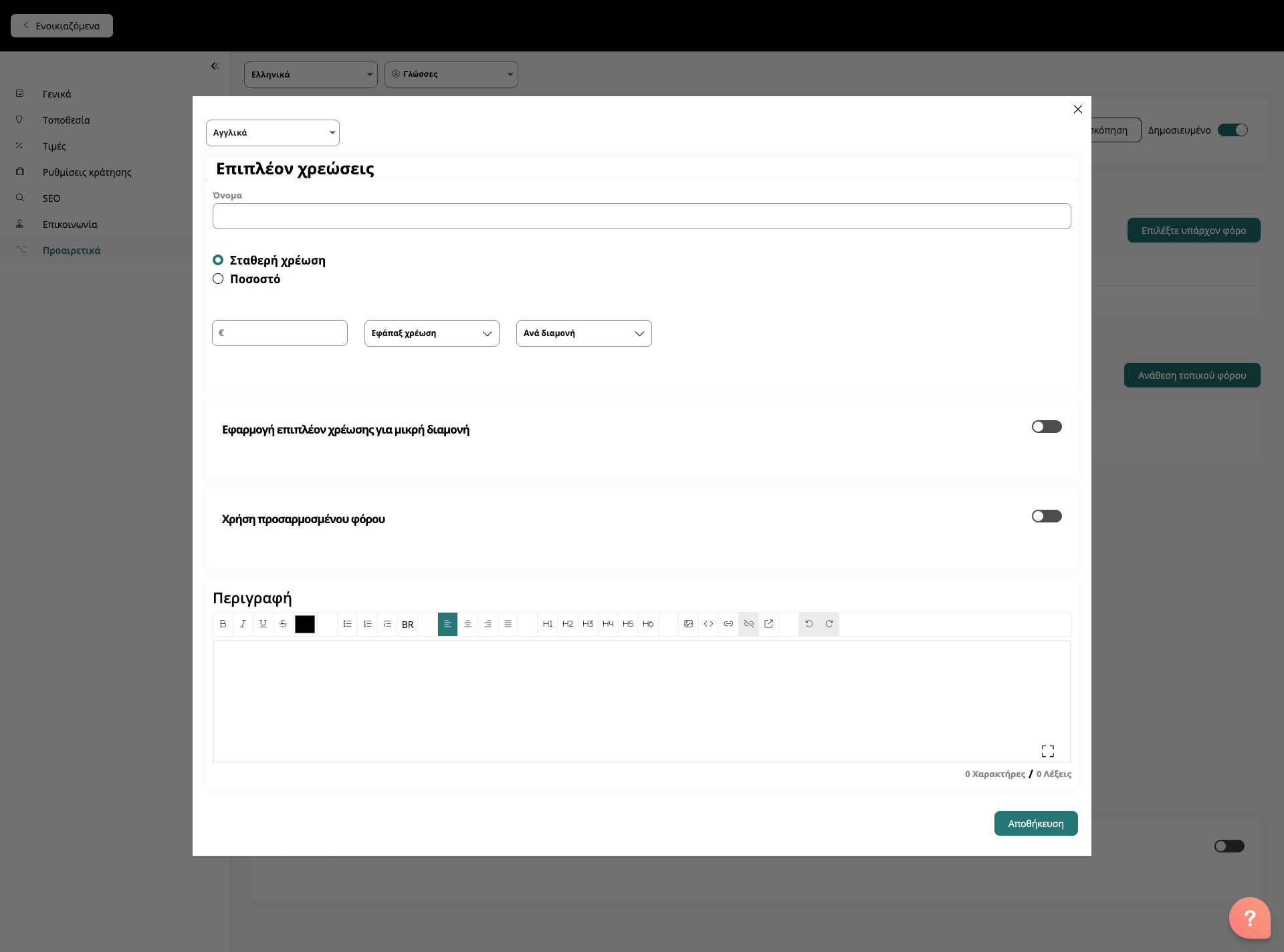 Σε αυτήν την ενότητα, μπορείτε να ορίσετε πρόσθετες χρεώσεις που δεν περιλαμβάνονται στην τιμή του δωματίου, όπως κόστος καθαρισμού, προμήθειες και πρόσθετους φόρους σύμφωνα με τις τοπικές οδηγίες και κανονισμούς.