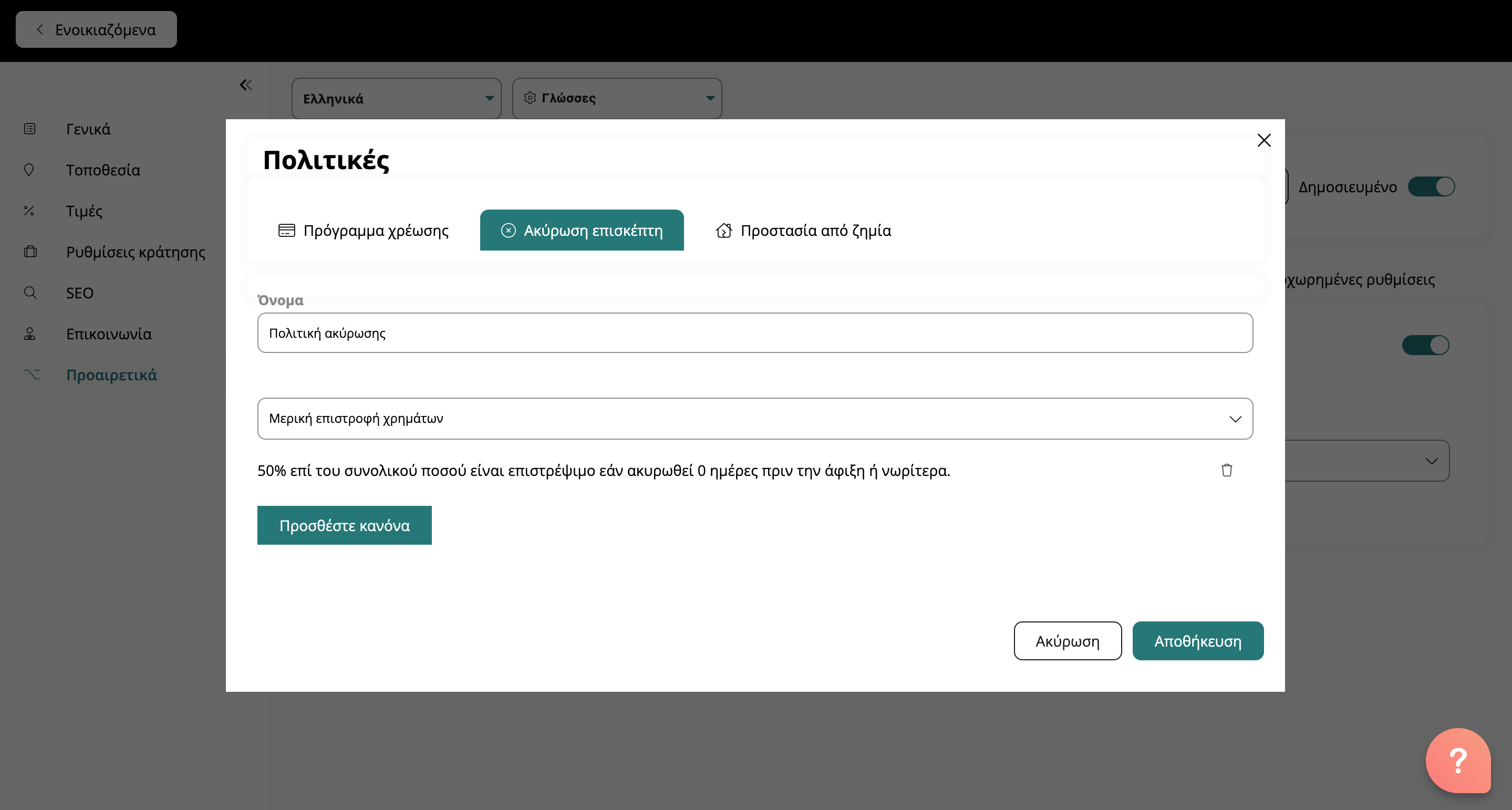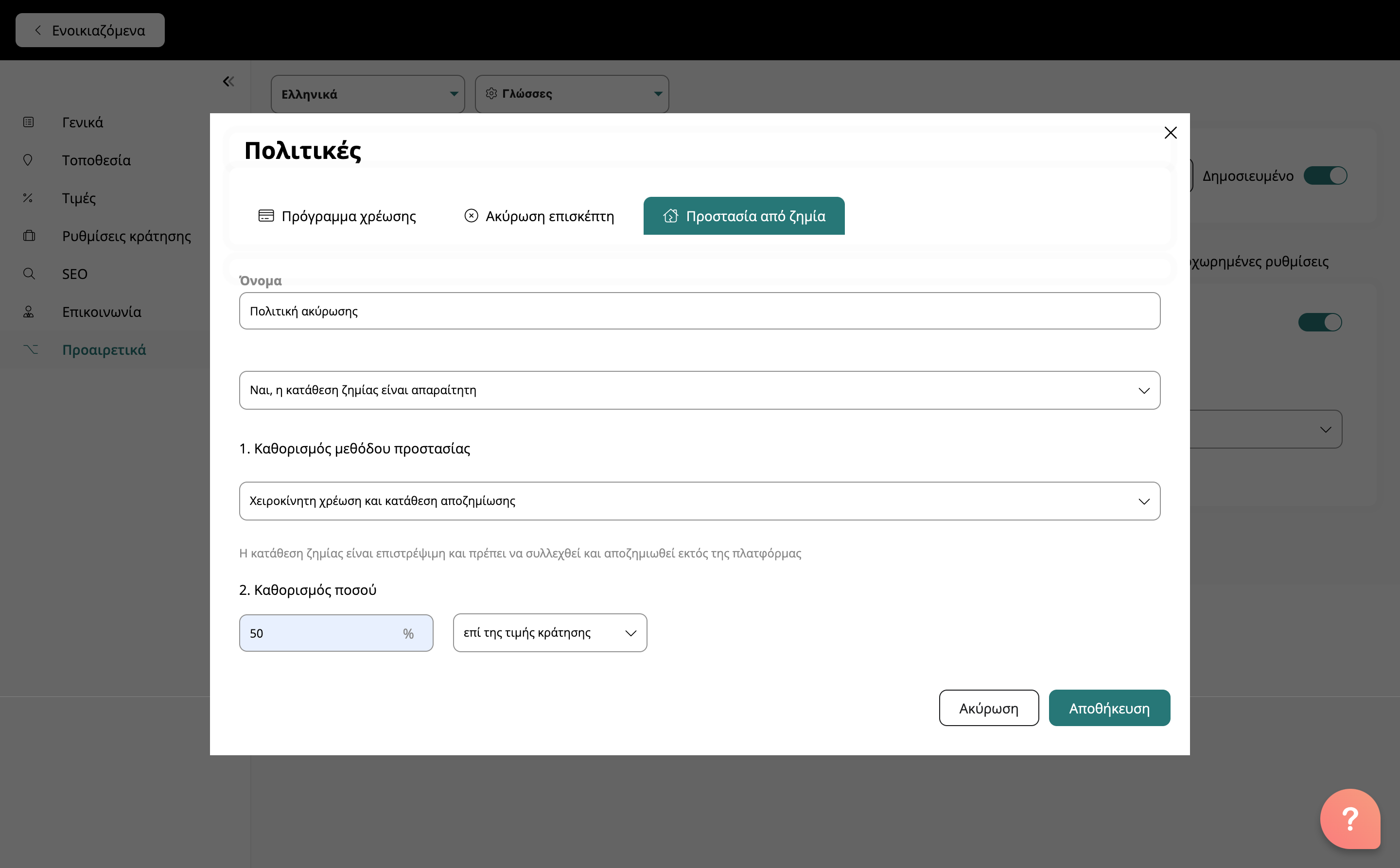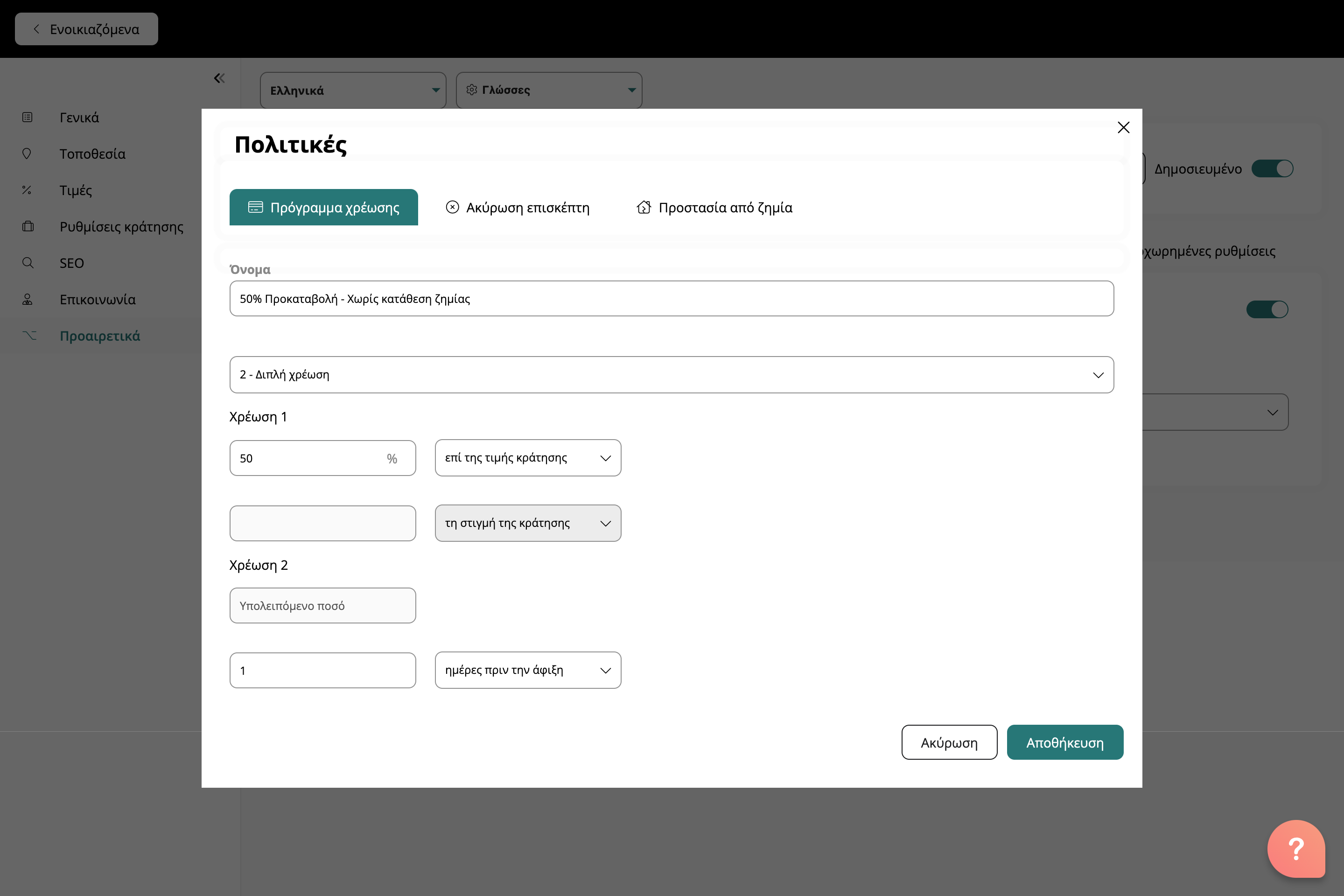 Όνομα: Εισάγετε το όνομα της πολιτικής, π.χ. 50% Προκαταβολή - Χωρίς κατάθεση ζημίας. Αυτό το όνομα θα είναι ορατό μόνο σε εσάς και όχι στους επισκέπτες σας.