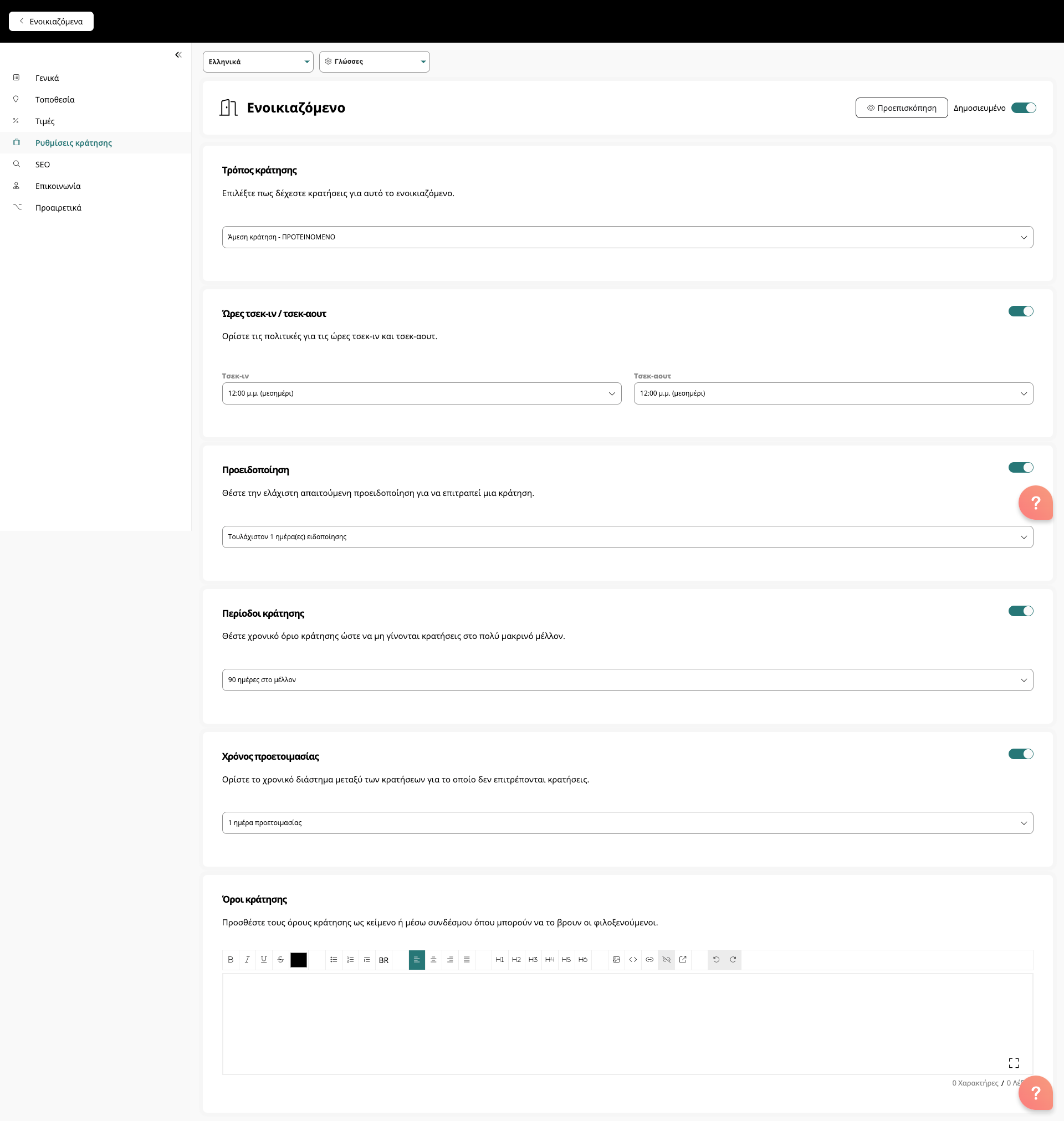 Όροι κράτησης: Καθορίστε τους όρους και τους κανονισμούς κράτησης για τους επισκέπτες σας. Μπορείτε για παράδειγμα να συμπεριλάβετε τους τρόπους πληρωμής, την πολιτική καπνίσματος, τις προκαταβολές, τον κανονισμό κατοικίδιων κ.λπ.