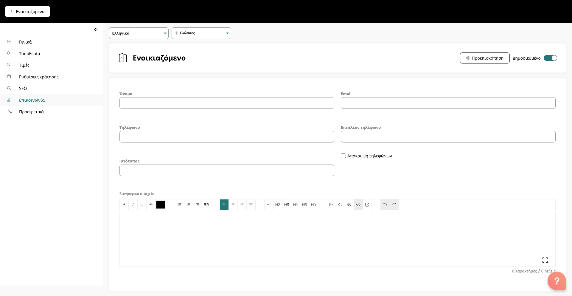 Προσθέστε τα στοιχεία επικοινωνίας του καταλύματός σας (όνομα, email, τηλέφωνο, επιπλέον τηλέφωνο, ιστότοπος) και γράψτε λίγα λόγια στο πεδίο Βιογραφικά στοιχεία για τους πελάτες σας. Τα στοιχεία επικοινωνίας είναι κενά όταν δημιουργείτε το ενοικιαζόμενό σας, ωστόσο μπορείτε να τα επεξεργαστείτε όποτε θέλετε. Τα στοιχεία επικοινωνίας μπορεί να μην ισχύουν πάντα για την επιχείρησή σας, αλλά χρησιμοποιούνται συχνά: