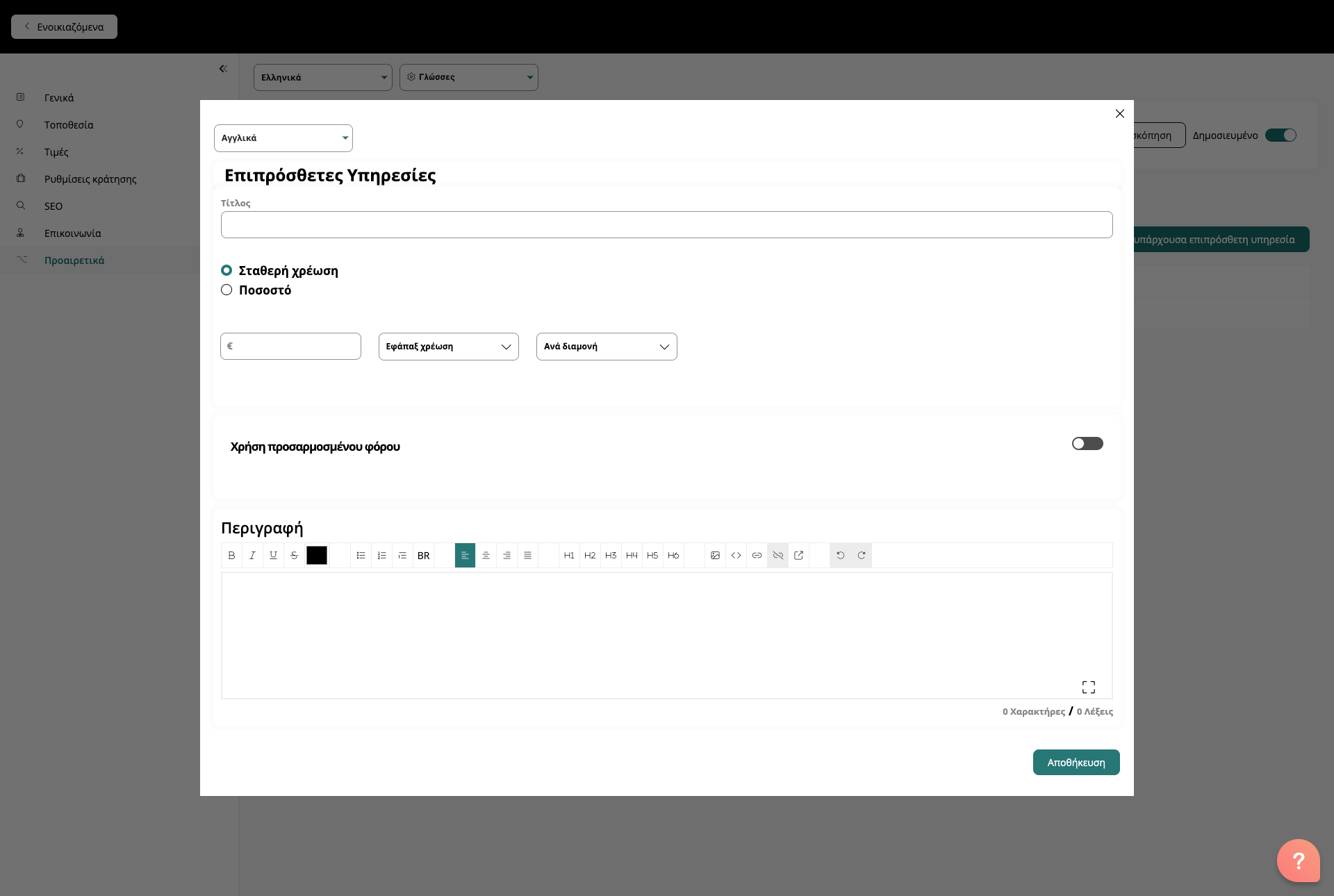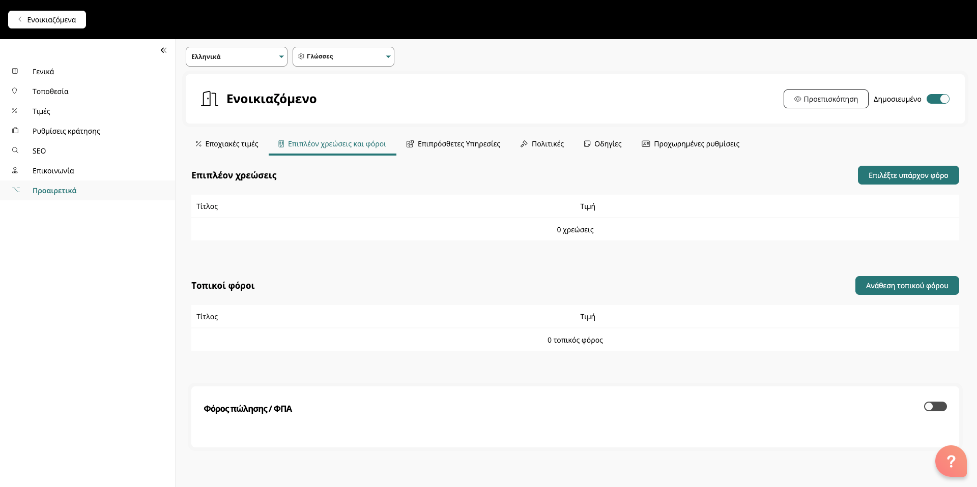 Οι επιπρόσθετες επιλογές σας επιτρέπουν να προσφέρετε πρόσθετες υπηρεσίες για το κατάλυμά σας. Ακολουθήστε τα παρακάτω βήματα για να δημιουργήσετε και να ρυθμίσετε τις επιπρόσθετες επιλογές για το ενοικιαζόμενό σας.