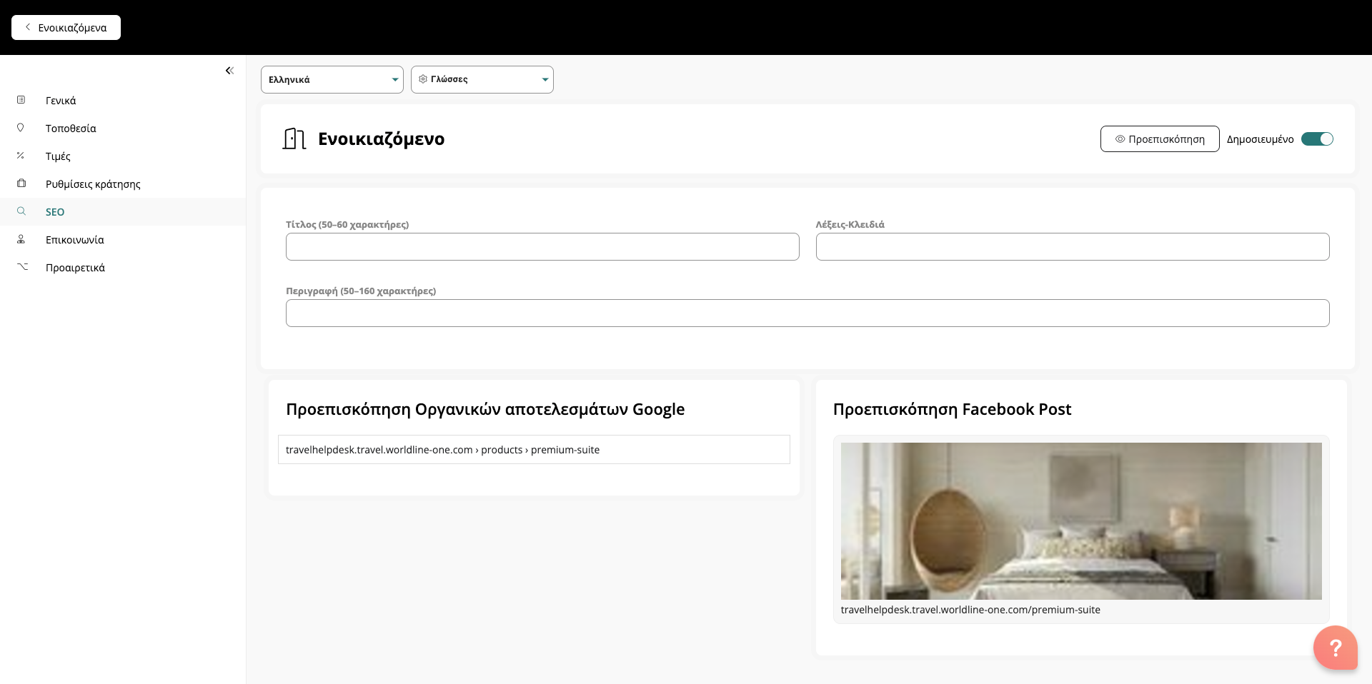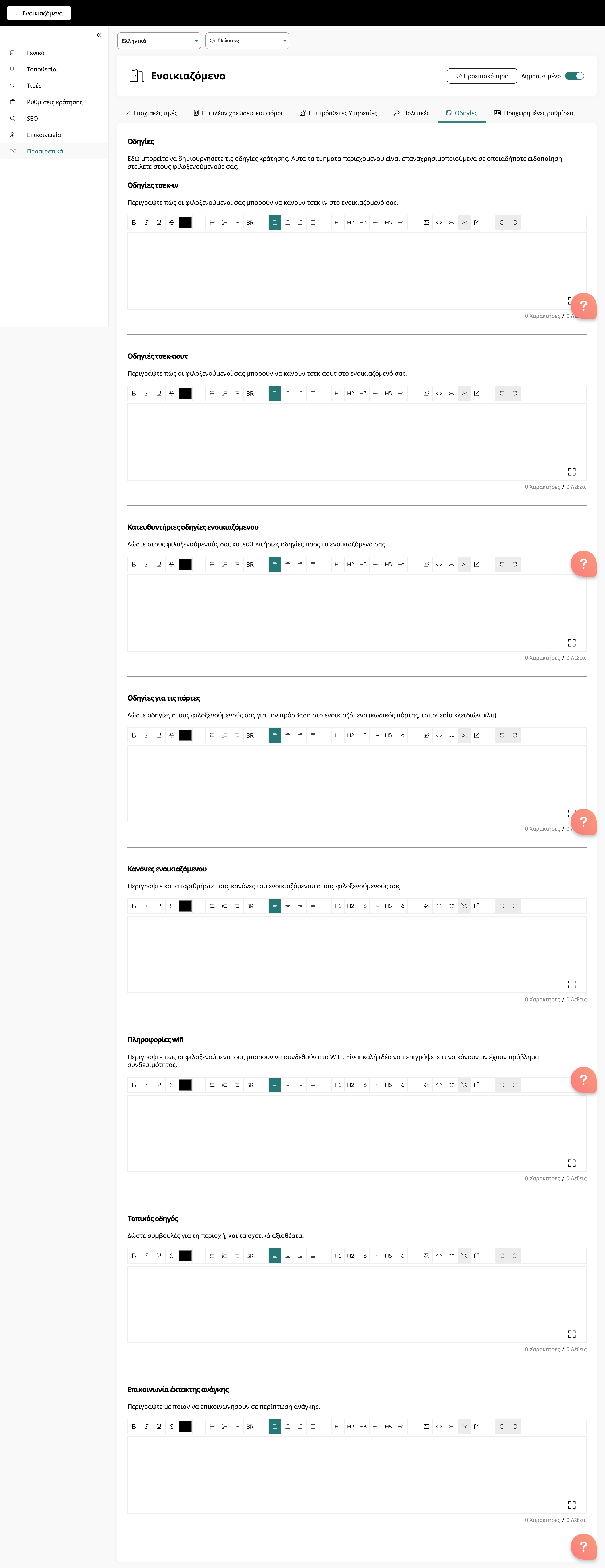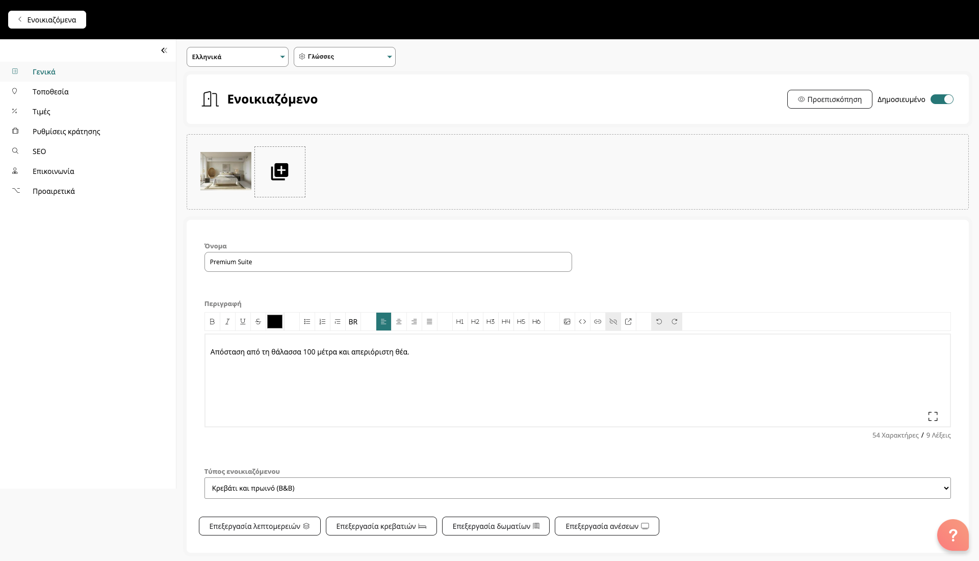 Δημοσιευμένο: Όταν ολοκληρώσετε την επεξεργασία του καταλύματός σας, τσεκάρετε το πλαίσιο πάνω δεξιά στην οθόνη σας για να το δημοσιεύσετε. Με τον τρόπο αυτό το κατάλυμα θα δημοσιευθεί στο website σας. Εάν επιλέξετε να μη δημοσιευθεί το κατάλυμά σας, αυτό θα εξακολουθεί να είναι διαθέσιμο για κράτηση, αλλά δεν θα εμφανίζεται στη λίστα των ενοικιαζόμενών σας.