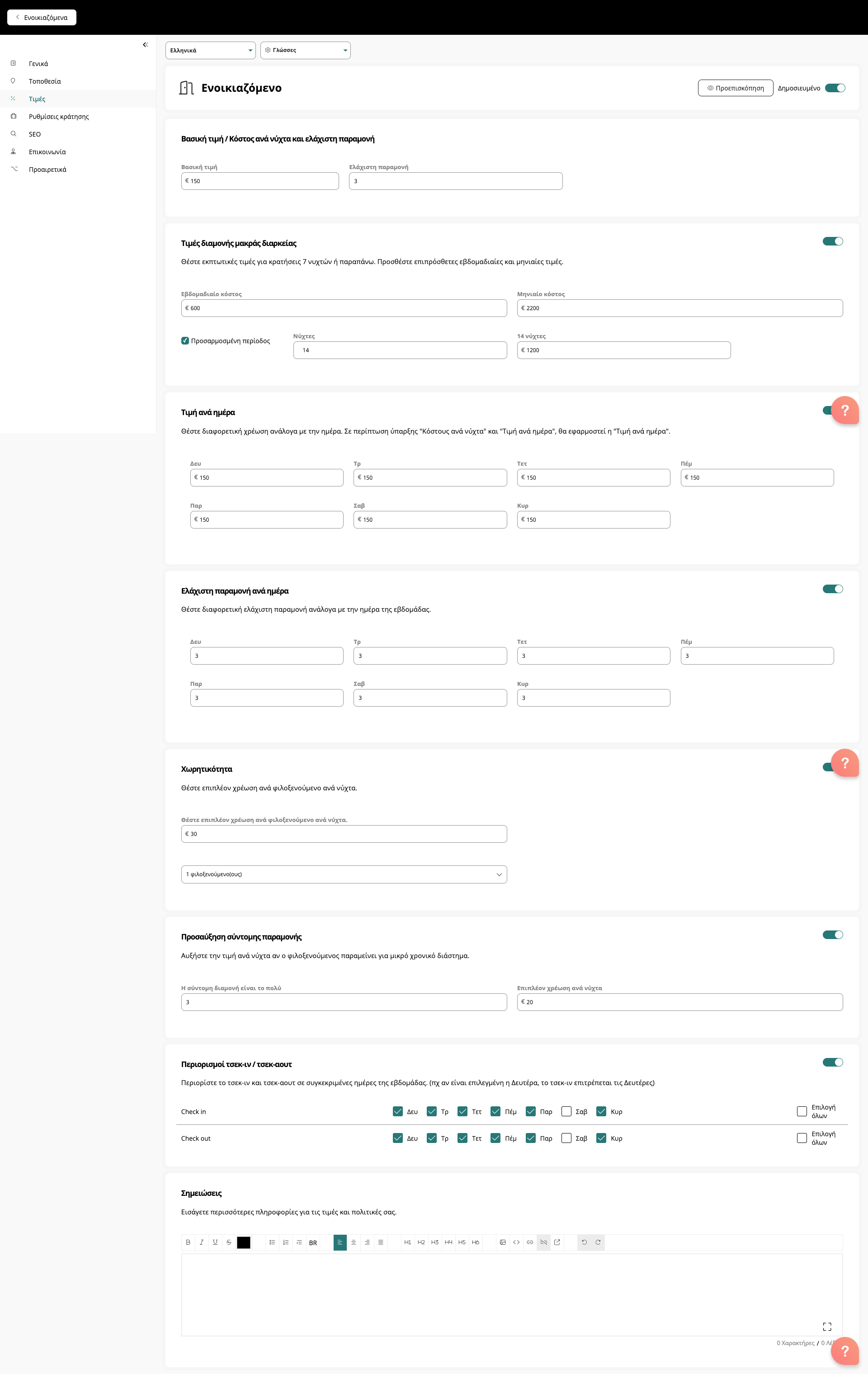 Τιμές διαμονής μακράς διαρκείας : Για να ορίσετε μια εβδομαδιαία ή/και μηνιαία χρέωση, ενεργοποιήστε το κουμπί και εισαγάγετε την τιμή ανά εβδομάδα και μήνα.