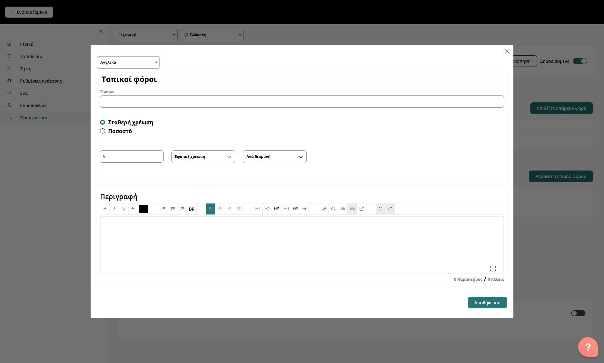 Για να ορίσετε φόρο πώλησης/ΦΠΑ για το ενοικιαζόμενό σας ενεργοποιήστε το κουμπί. Μπορείτε να επιλέξετε έναν από τους υπάρχοντες φόρους σας ή να δημιουργήσετε έναν νέο κάνοντας κλικ στο Δημιουργήστε νέο φόρο. Επιλέξτε εάν ο φόρος θα συμπεριλαμβάνεται στην τιμή ή όχι και εισαγάγετε το ποσοστό.