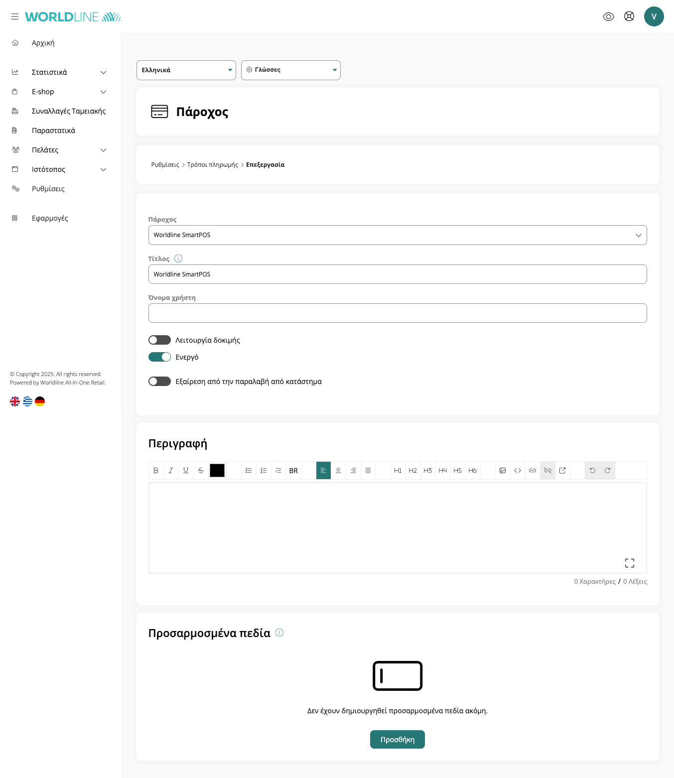 10. Θα τσεκάρετε την επιλογή Ενεργό για να ενεργοποιήσετε τον τρόπο πληρωμής και θα αποθηκεύσετε τις αλλαγές σας κάνοντας κλικ στο κουμπί Αποθήκευση πάνω δεξιά στην οθόνη σας.
