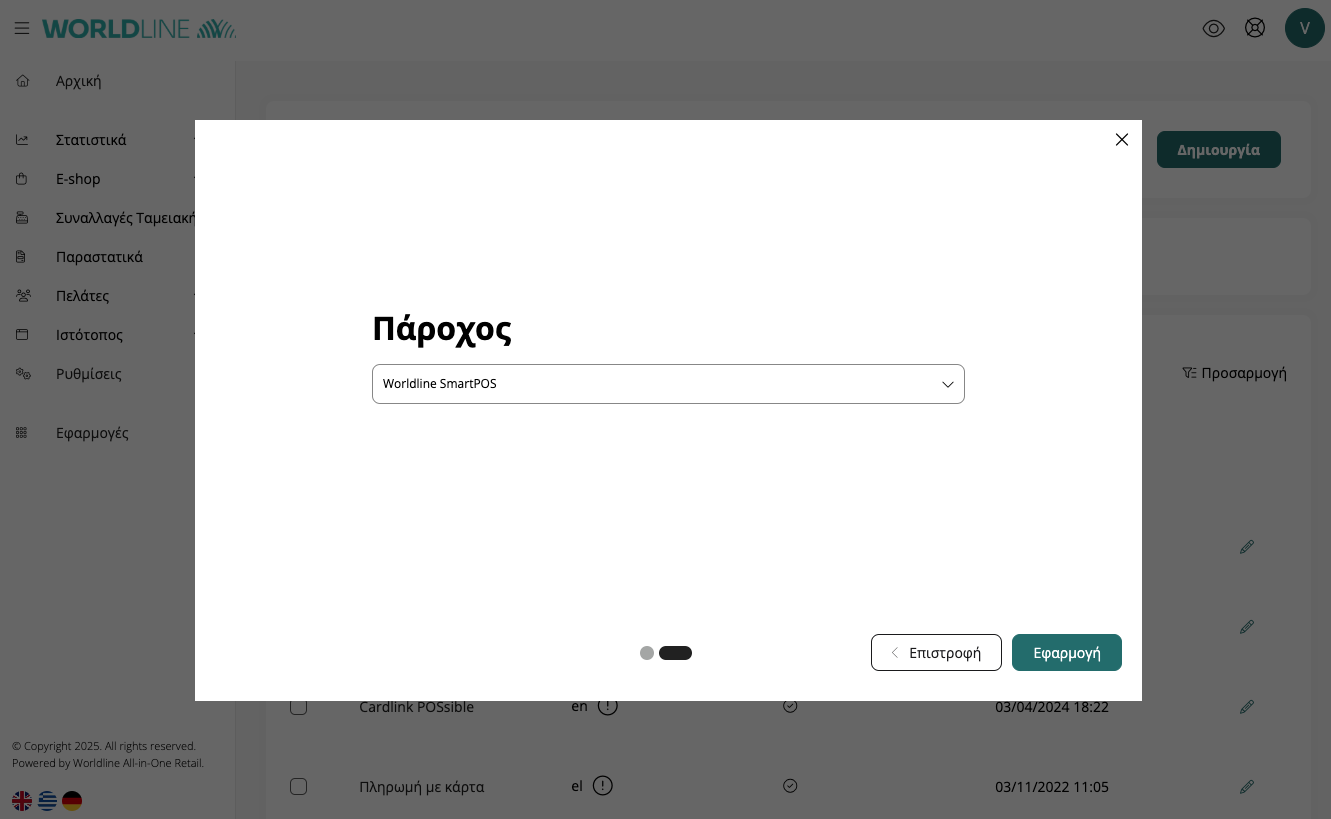 7. Θα επιλέξετε ως πάροχο Worldline SmartPOS και θα πατήσετε Εφαρμογή.