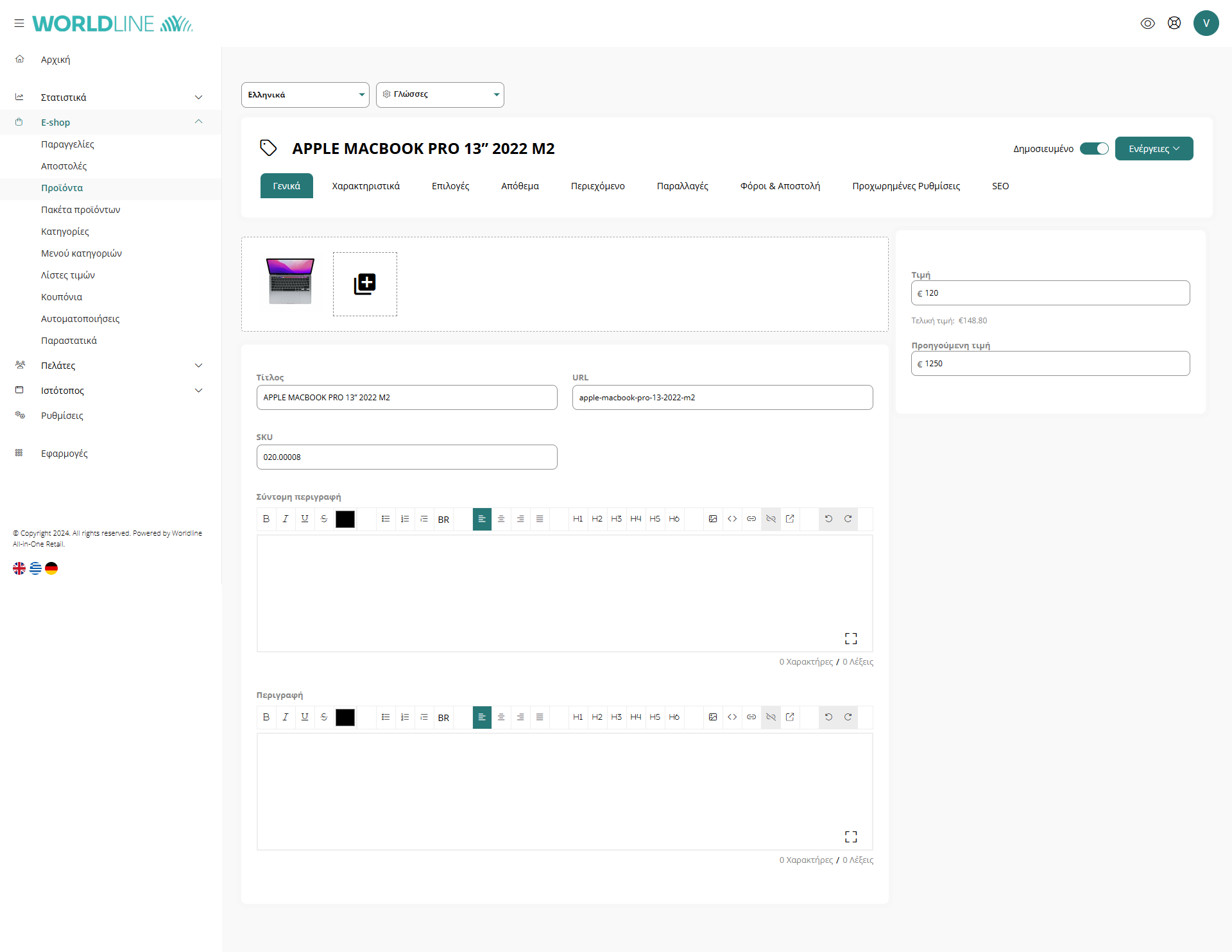 Εικόνα. Μπορείτε να προσθέσετε εικόνες για να παρουσιάσετε τα προϊόντα σας κάνοντας κλικ στο κουμπί +. Η εικόνα του προϊόντος θα εμφανιστεί στην αντίστοιχη τοποθεσία της σελίδας του προϊόντος σας ανάλογα με τον τρόπο εμφάνισης που έχετε επιλέξει προηγουμένως από τις Ρυθμίσεις στην καρτέλα "Εικαστικό". Εάν υπάρχουν πολλές εικόνες, η αριστερή είναι η βασική εικόνα του προϊόντος. Μπορείτε να τροποποιήσετε τη σειρά εμφάνισης των εικόνων σας. Απλώς σύρετε και τοποθετήστε τες εκεί που θέλετε. Εάν δεν έχετε ακόμη εικόνες για το προϊόν σας, μπορείτε να παραλείψετε αυτό το βήμα.