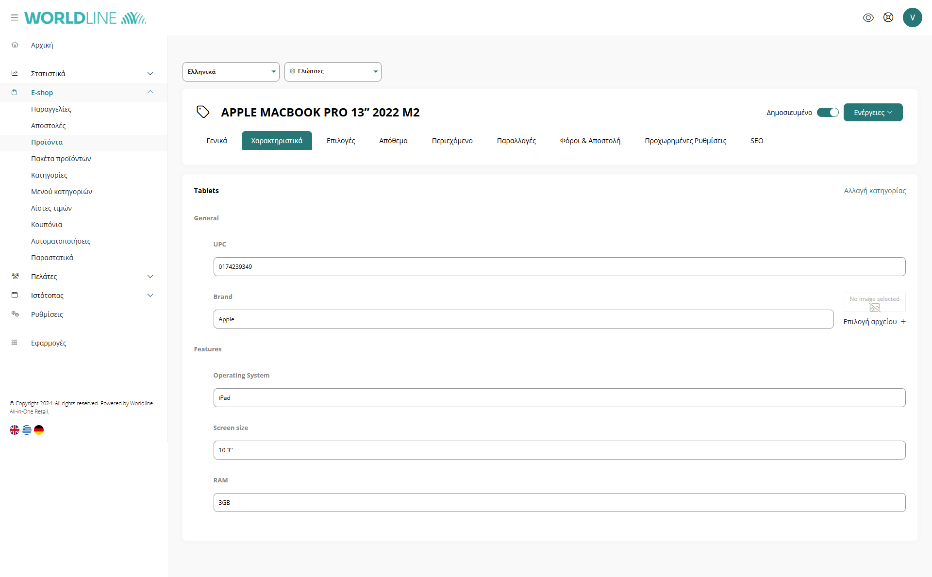 Καρτέλα Χαρακτηριστικά. Επιλέξτε σε ποια κατηγορία ανήκει το προϊόν σας από τις υπάρχουσες που έχετε ήδη δημιουργήσει. Στη συνέχεια συμπληρώστε τα χαρακτηριστικά του προϊόντος ανάλογα με την κατηγορία στην οποία ανήκει. Για να μάθετε περισσότερα σχετικά με τις κατηγορίες προϊόντων επισκεφθείτε τη σελίδα που έχουμε δημιουργήσει για τις κατηγορίες προϊόντων.