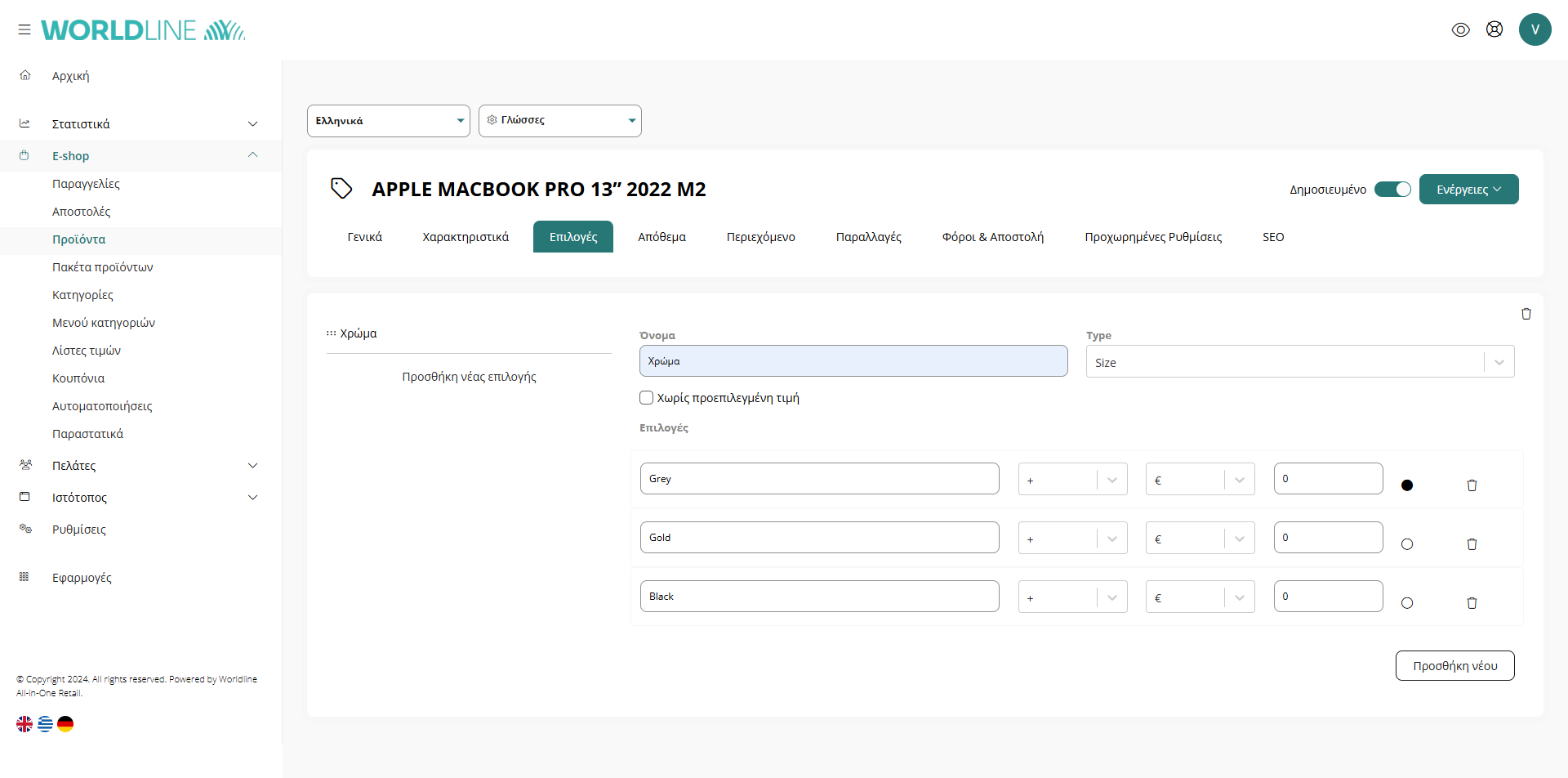 Για παράδειγμα, μπορείτε να προσθέσετε επιλογές όπως χρώμα, μέγεθος, στυλ, υλικό, μήκος κ.λπ. και να ορίσετε τις αντίστοιχες τιμές και ποσότητες, εάν θέλετε.