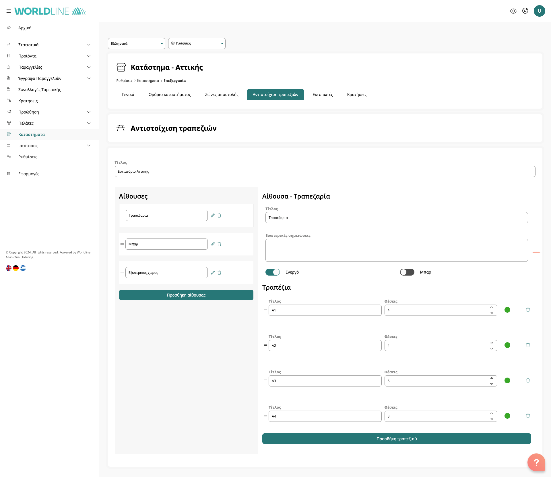 Είστε πλέον έτοιμοι να αρχίσετε να προσθέτετε αίθουσες στο κατάστημά σας. Οι αίθουσες αντιπροσωπεύουν τους διαθέσιμους χώρους εξυπηρέτησης του καταστήματός σας, όπως τραπεζαρία, αίθριο, μπαρ κ.λπ. Μπορείτε να δημιουργήσετε όσους χώρους χρειάζεστε για κάθε ένα από τα καταστήματά σας.
