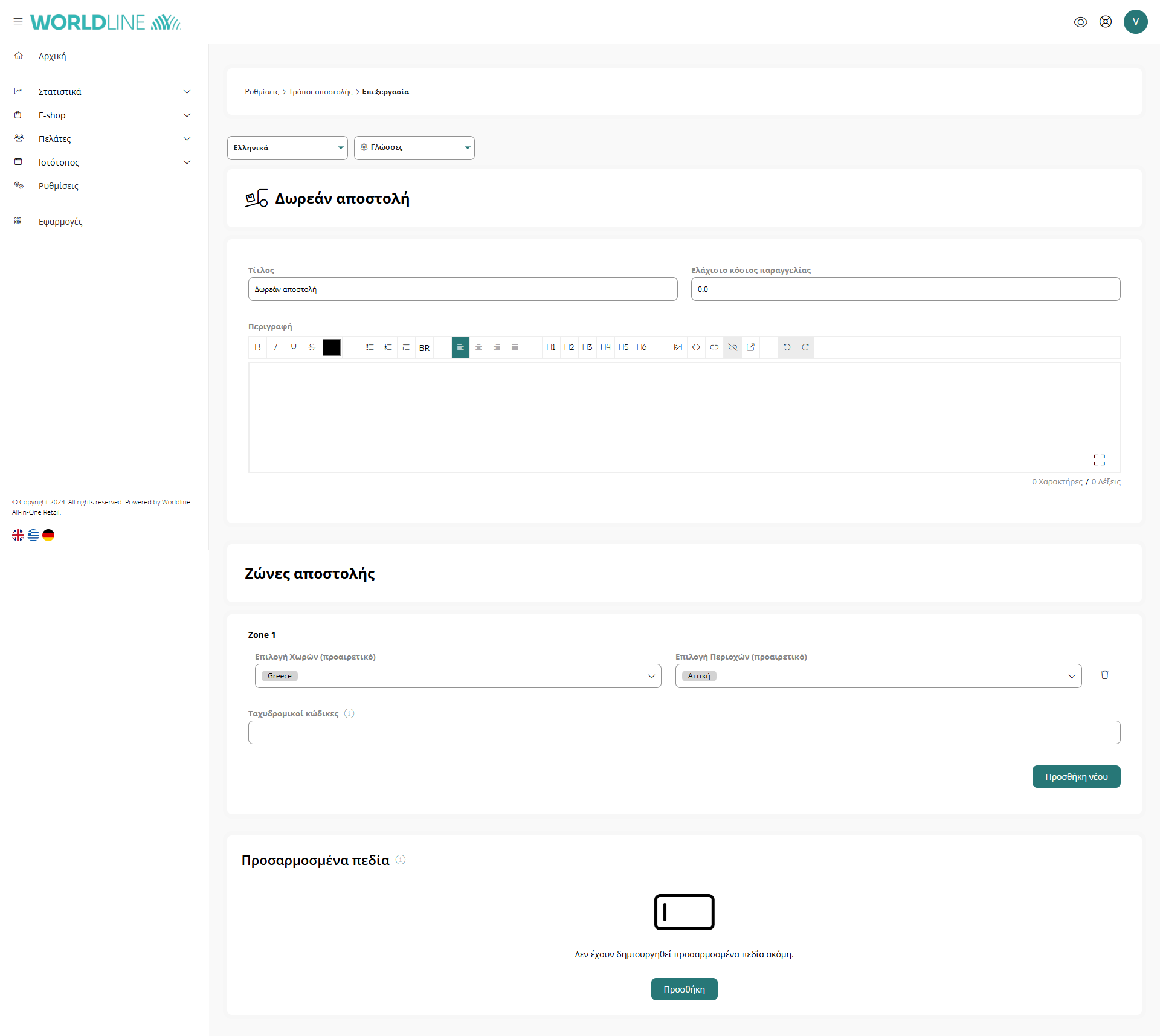 Το Worldline One Retail σας δίνει τη δυνατότητα να δημιουργήσετε πολλές ζώνες αποστολής ανάλογα με τις περιοχές που εξυπηρετείτε.