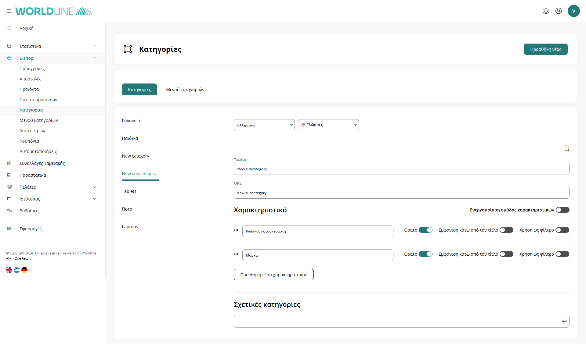 Το Worldline One Retail σας επιτρέπει να δημιουργείτε πολλές κατηγορίες προϊόντων και να τις εκχωρείτε εύκολα στα προϊόντα σας. Για να δημιουργήσετε την πρώτη σας κατηγορία προϊόντων, επισκεφθείτε τον πίνακα διαχείρισης, επιλέξτε Κατηγορίες από το ...