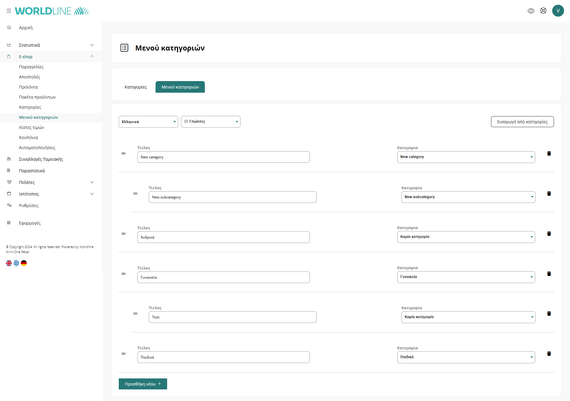 Το Worldline One Retail σας επιτρέπει να δημιουργήσετε κατηγορίες με πολλαπλά επίπεδα. Οι κατηγορίες πρώτου επιπέδου είναι οι κατηγορίες ρίζας. Αυτές είναι οι κατηγορίες που βλέπουν οι πελάτες σας στα κύρια μενού πλοήγησης. Μπορείτε επίσης να δημιουργήσετε υποκατηγορίες δεύτερου, τρίτου επιπέδου κτλ. Για να δημιουργήσετε μια υποκατηγορία πρέπει να έχετε ήδη δημιουργήσει μία κατηγορία. Μάθετε περισσότερα για τις κατηγορίες εδώ.