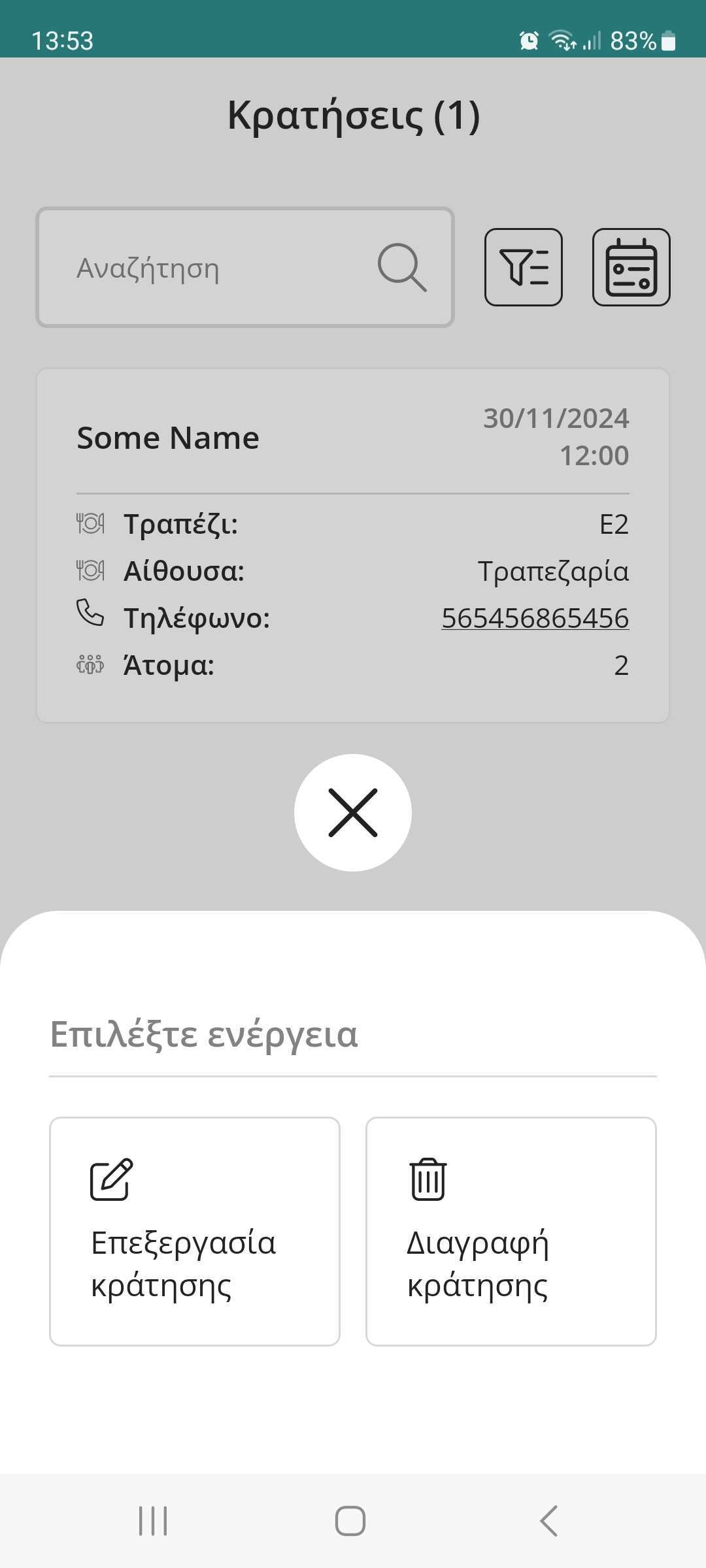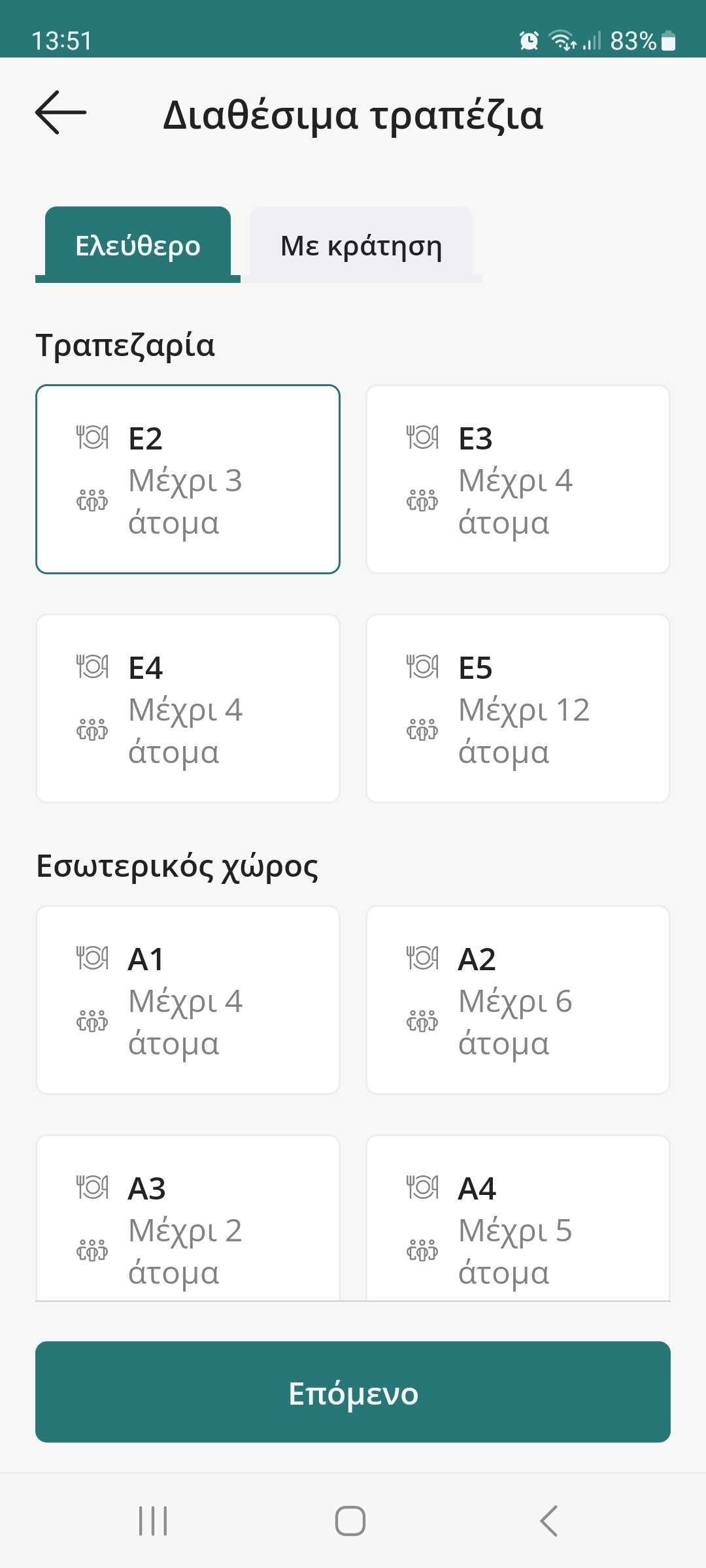 Σε αυτό το μενού, μπορείτε να δείτε τα τραπέζια που είναι διαθέσιμα αυτή τη στιγμή και εκείνα με υπάρχουσες κρατήσεις.