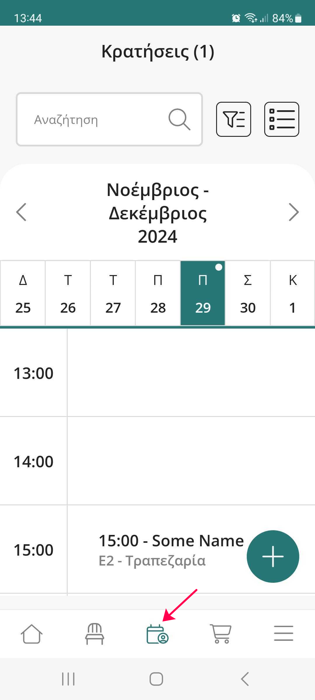 1. Ανοίξτε την εφαρμογή Worldline All-in-one Ordering και μεταβείτε στην επιλογή Κρατήσεις πατώντας στο εικονίδιο του ημερολογίου.
