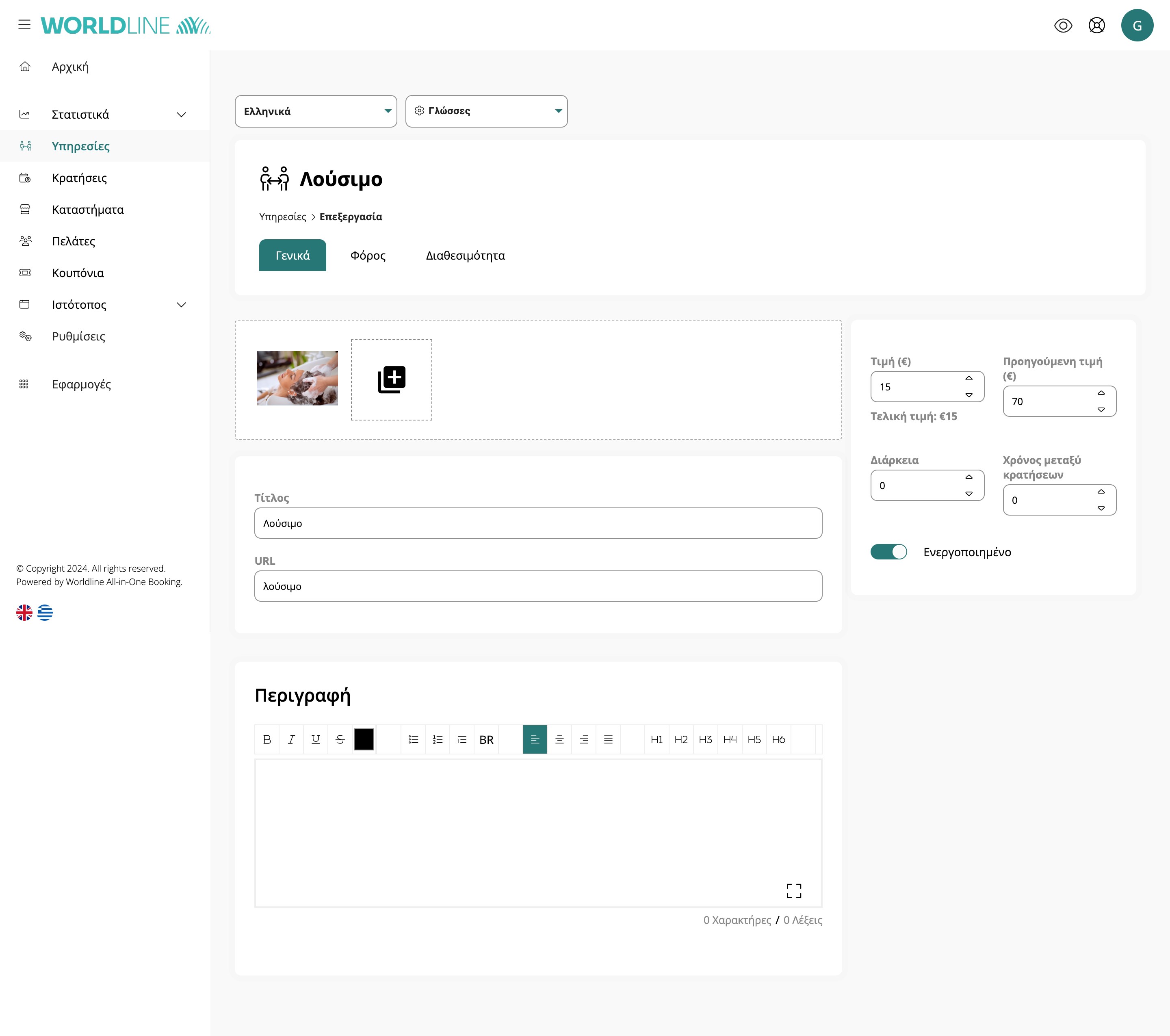Ενεργοποιημένο: Σας επιτρέπει να ορίσετε αν επιθυμείτε να δημοσιευτεί η υπηρεσία σας στη σελίδα του καταστήματός σας. Εάν δεν είναι ενεργοποιημένη αυτή η επιλογή, η υπηρεσία σας θα εξακολουθεί να είναι διαθέσιμη για αγορά, αλλά δε θα εμφανίζεται στη λίστα υπηρεσιών.