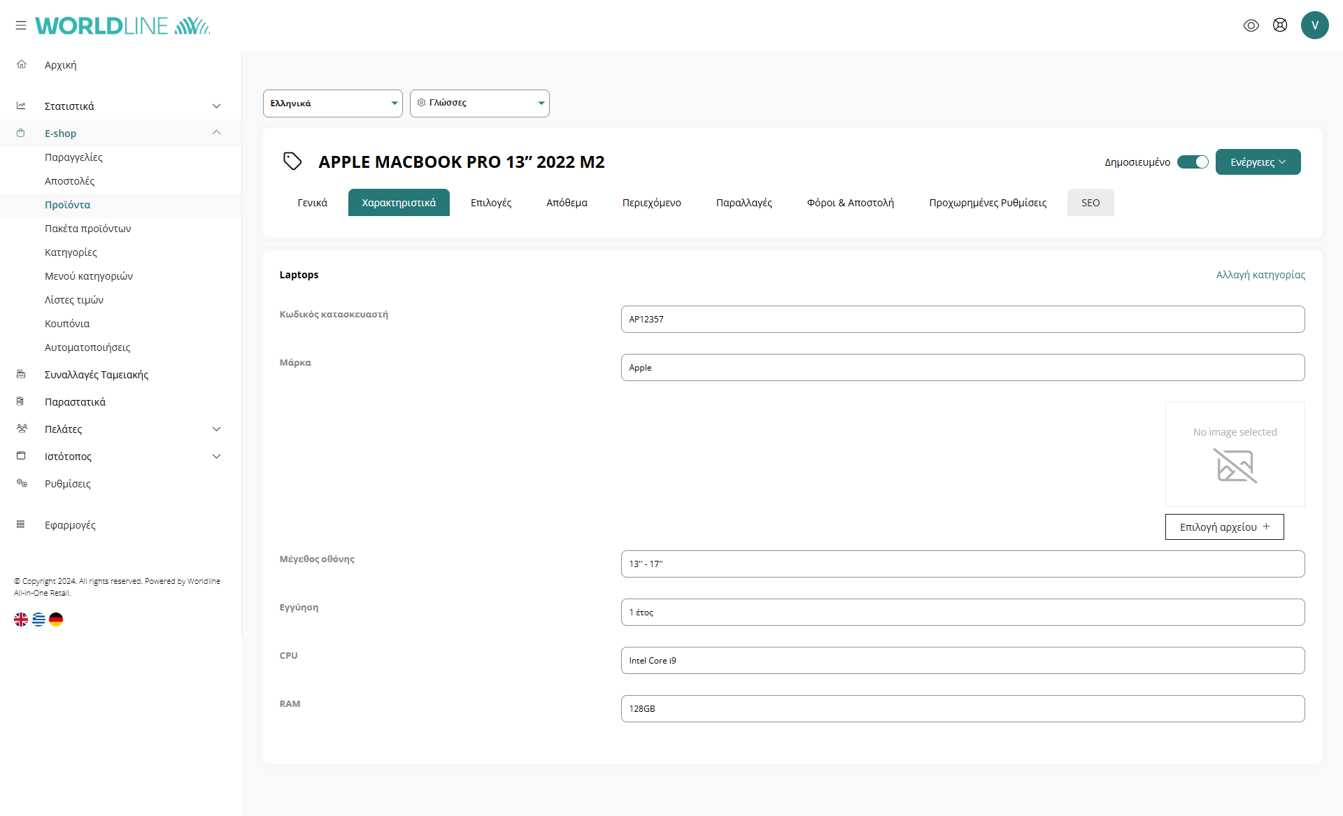 Μεταβείτε: E-shop > Προϊόντα Η πλατφόρμα του Worldline One Retail σας επιτρέπει να δημιουργήστε διαφορετικές παραλλαγές προϊόντων. Εάν έχετε ένα προϊόν με διαφορετικές επιλογές (όπως χρώμα, μέγεθος κ.λπ.) μπορείτε να προσθέσετε παραλλαγές του ...