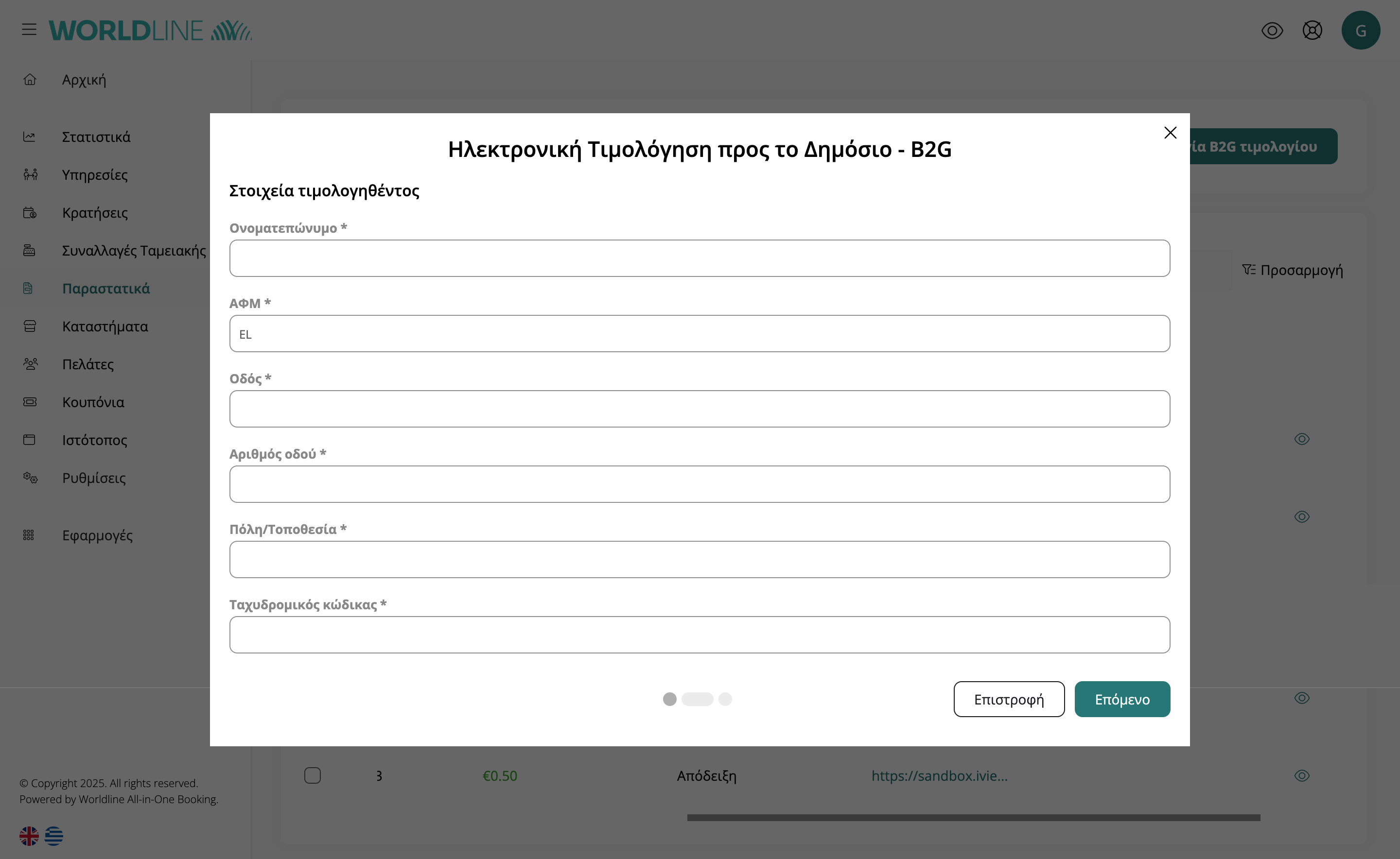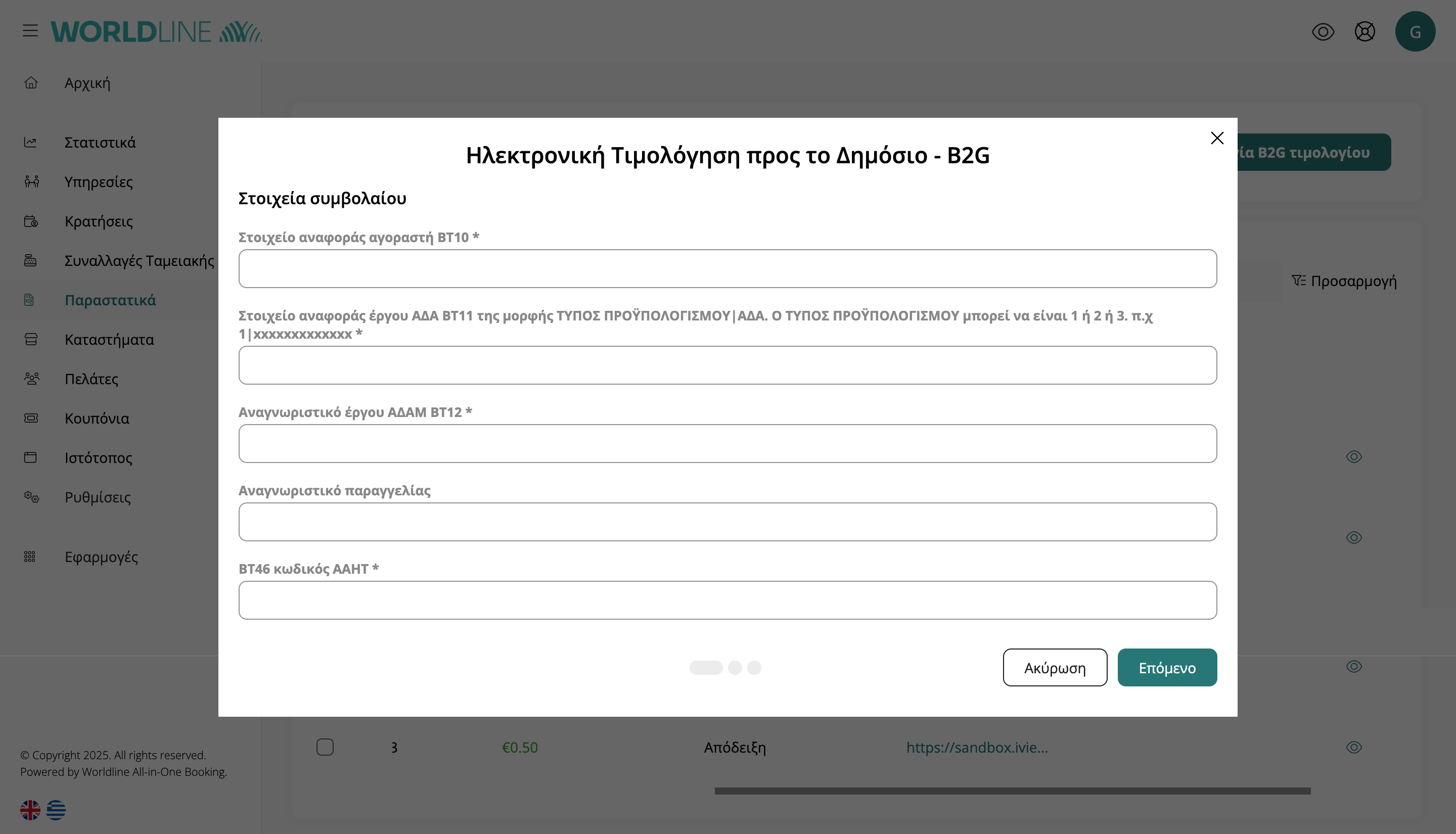 [Σημείωση]: Η διαδικασία έκδοσης του τιμολογίου B2G απαιτεί συνήθως 20-30 δευτερόλεπτα για να ολοκληρωθεί. Μόλις το τιμολόγιο εκδοθεί επιτυχώς, θα εμφανιστεί στη λίστα με τα παραστατικά σας στην ενότητα Παραστατικά.