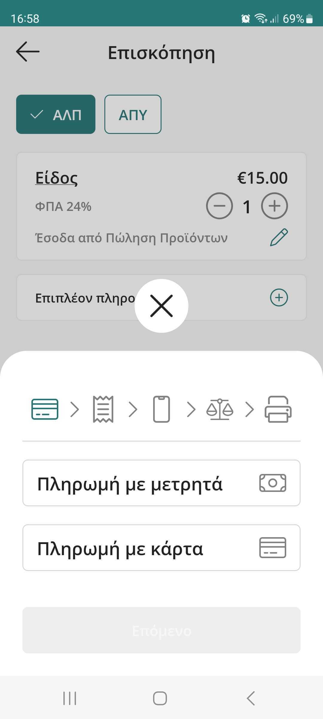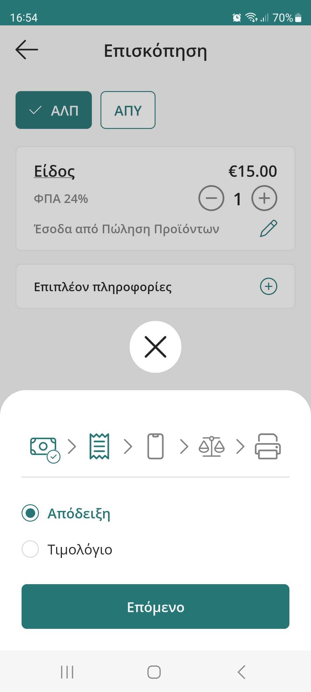 6. Επιλέξτε Έκδοση Απόδειξης ή τιμολογίου, ανάλογα με τις ανάγκες της συναλλαγής και πατήστε Επόμενο για να ολοκληρώσετε τη συναλλαγή σας.