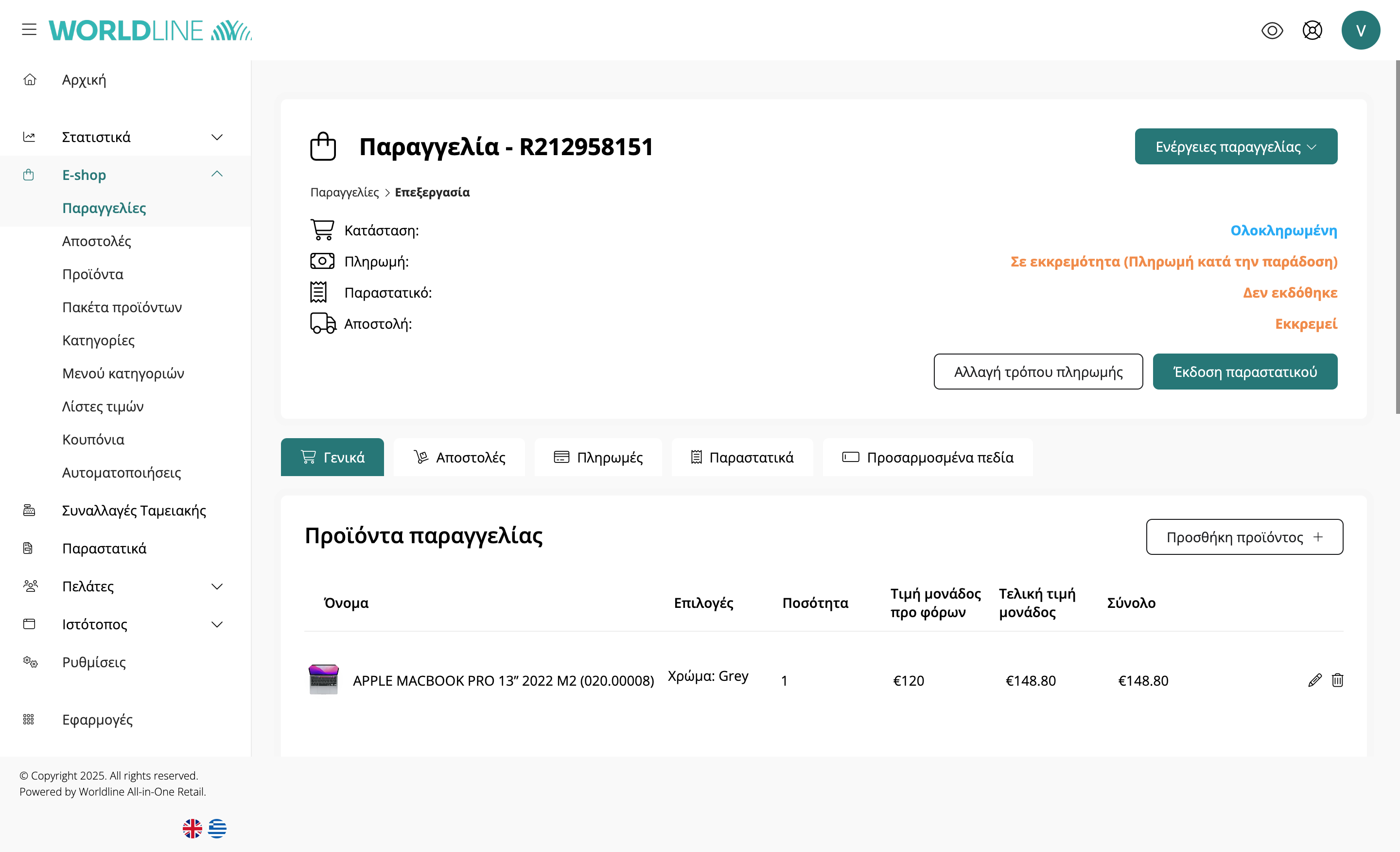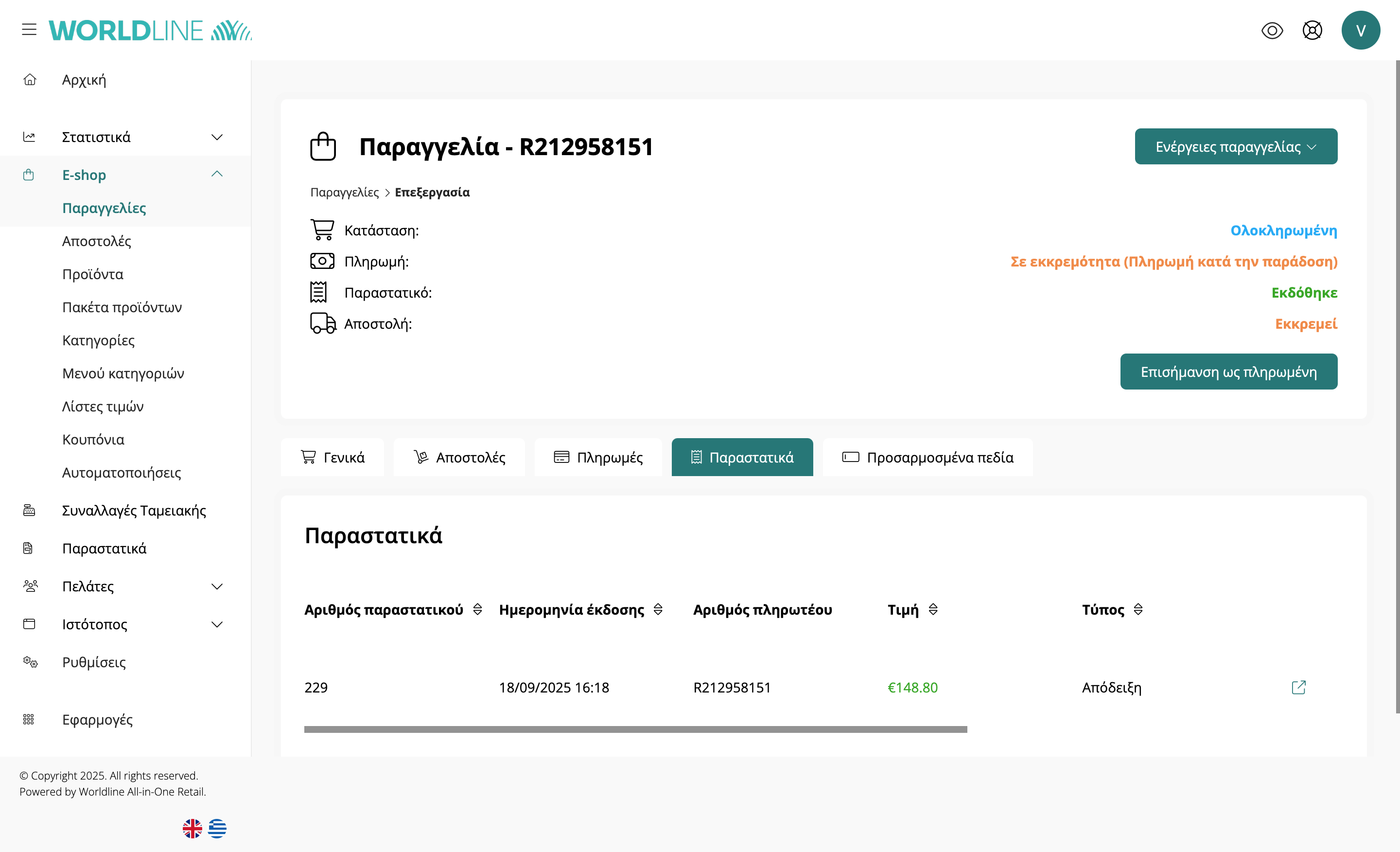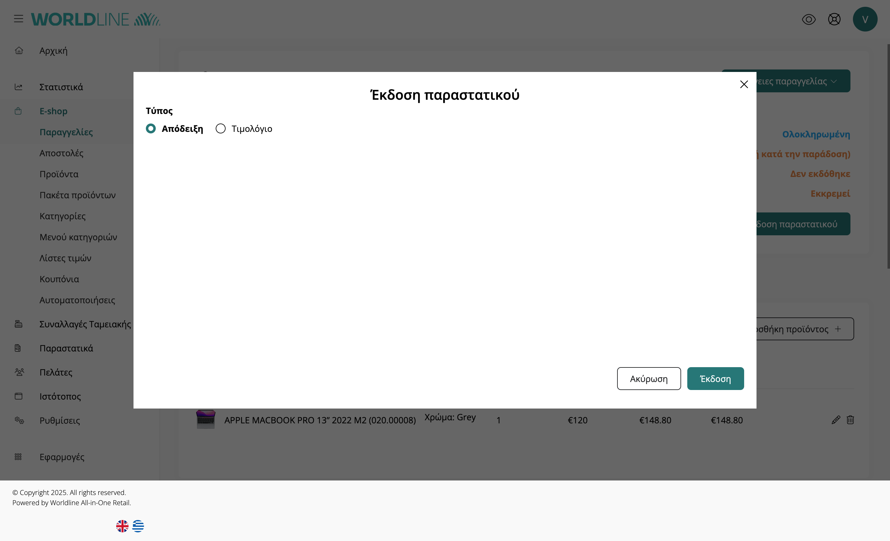 Για κάθε παραγγελία που υποβάλλεται από τους πελάτες σας, έχετε τη δυνατότητα να εκδώσετε παραστατικό εφόσον έχετε ενεργοποιημένο πάροχο ηλεκτρονικής τιμολόγησης. Ακολουθήστε τα παρακάτω βήματα: