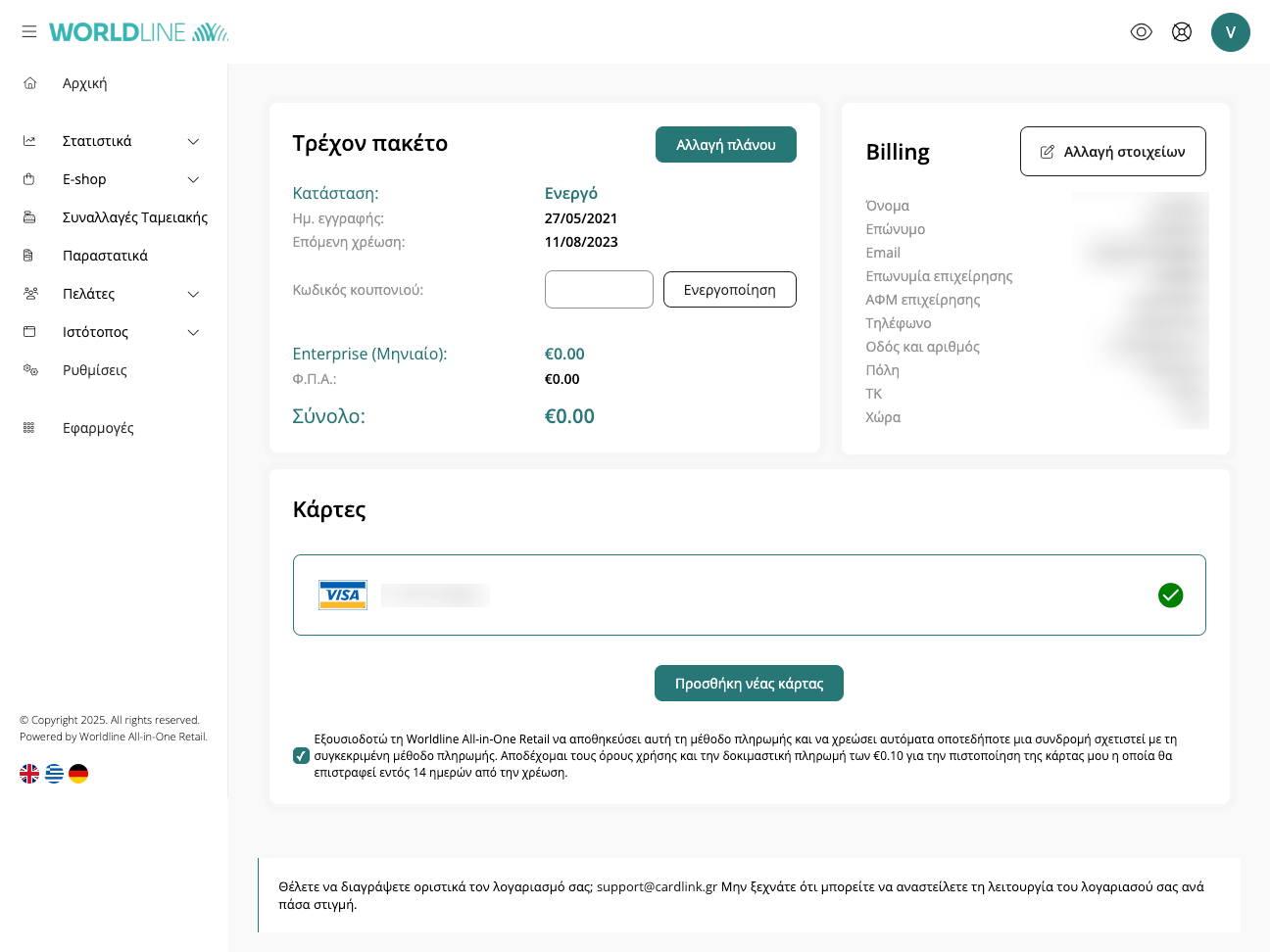 3. Στην ενότητα «Κάρτες», προσθέστε τα στοιχεία της κάρτας σας και πατήστε το κουμπί «Payment» για να τα καταχωρήσετε.