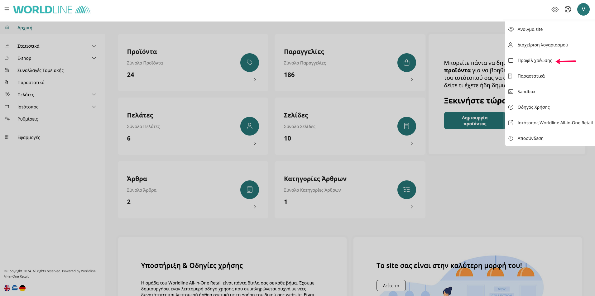 2. Μεταβείτε στο "Προφίλ Χρέωσης" κάνοντας κλικ στο αρχικό του ονόματος του καταστήματος στην πάνω δεξιά γωνία του διαχειριστικού σας.