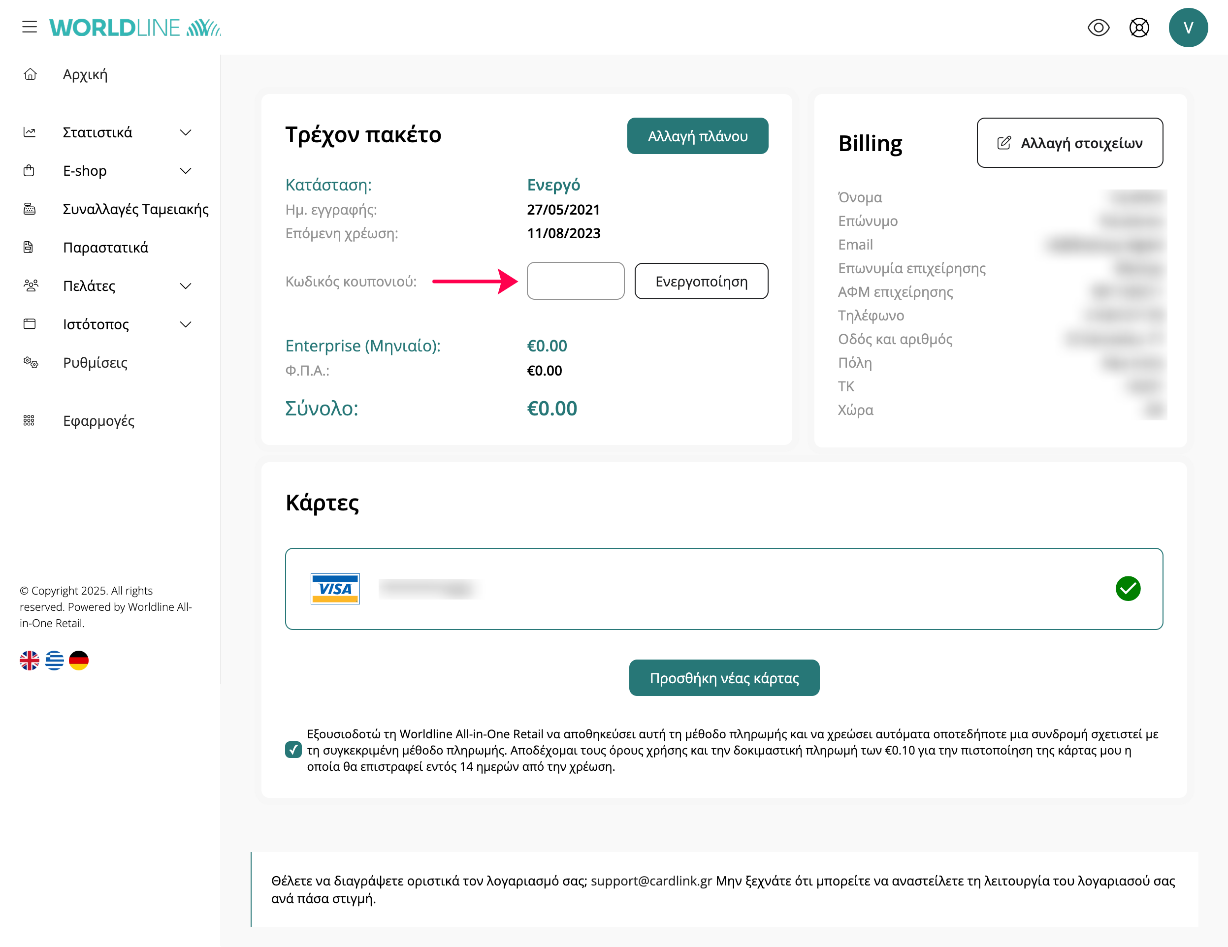 - Στο πάνω μέρος της ίδιας οθόνης θα δείτε το πεδίο "Κωδικός Κουπονιού". Εισάγετε εκεί τον κωδικό κουπονιού και πατήστε Ενεργοποίηση.