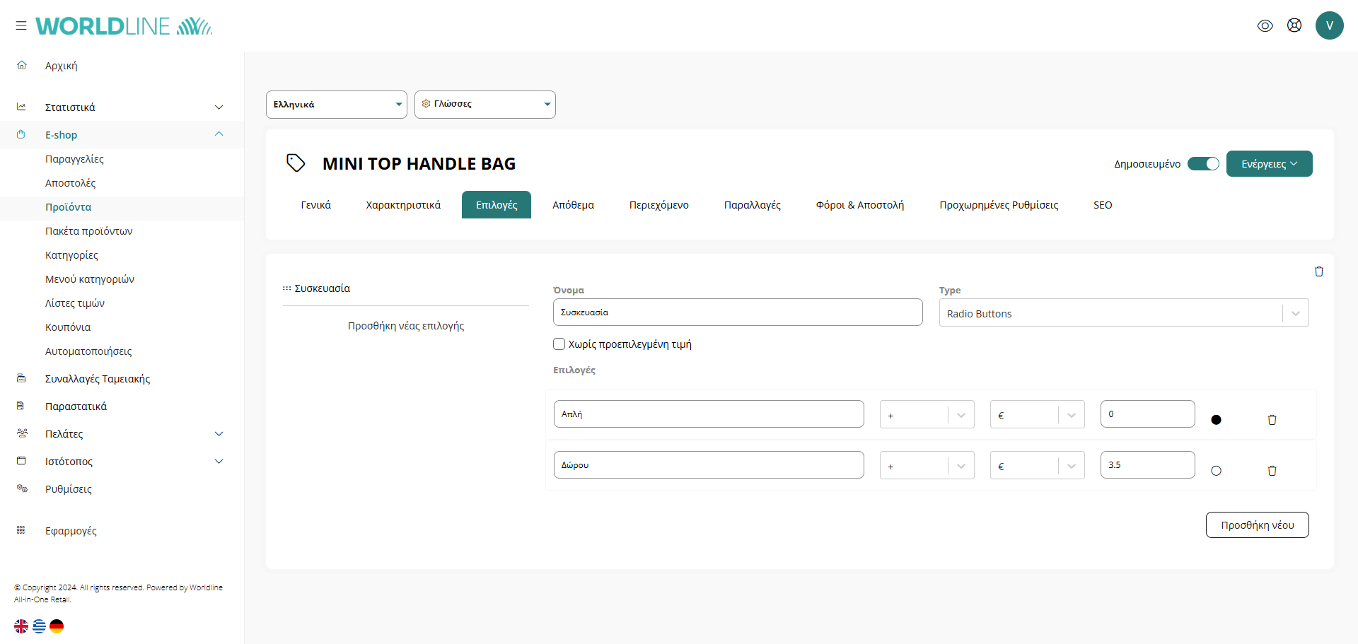 - Μεταβείτε E-shop < Προϊόντα από τον πίνακα διαχείρισης.