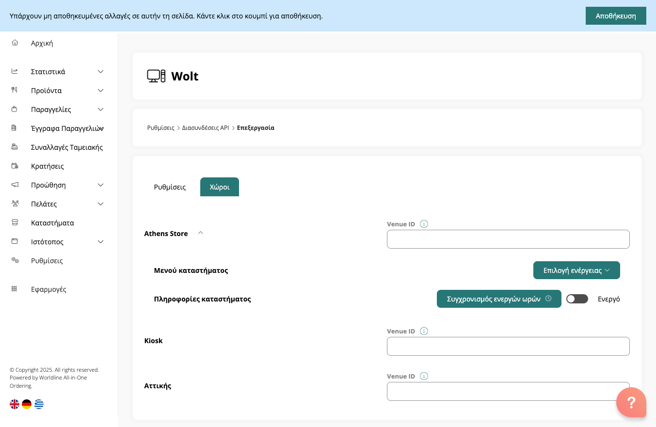 Σε περίπτωση που διαθέτετε περισσότερα από ένα καταστήματα, χρειάζεται να κάνετε αντιστοίχιση τοποθεσιών για κάθε κατάστημα, συμπληρώνοντας το αντίστοιχο Venue ID, που παρέχεται από τη Wolt.