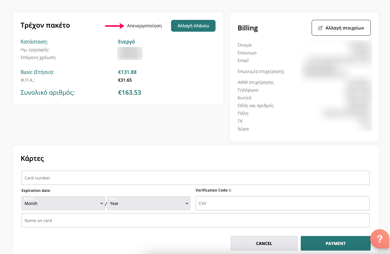 3. Στο πάνω μέρος της σελίδας σας στην ενότητα Τρέχον πακέτο, θα δείτε την επιλογή "Απενεργοποίηση". Κάντε κλικ εκεί για να απενεργοποιήσετε τον λογαριασμό σας.