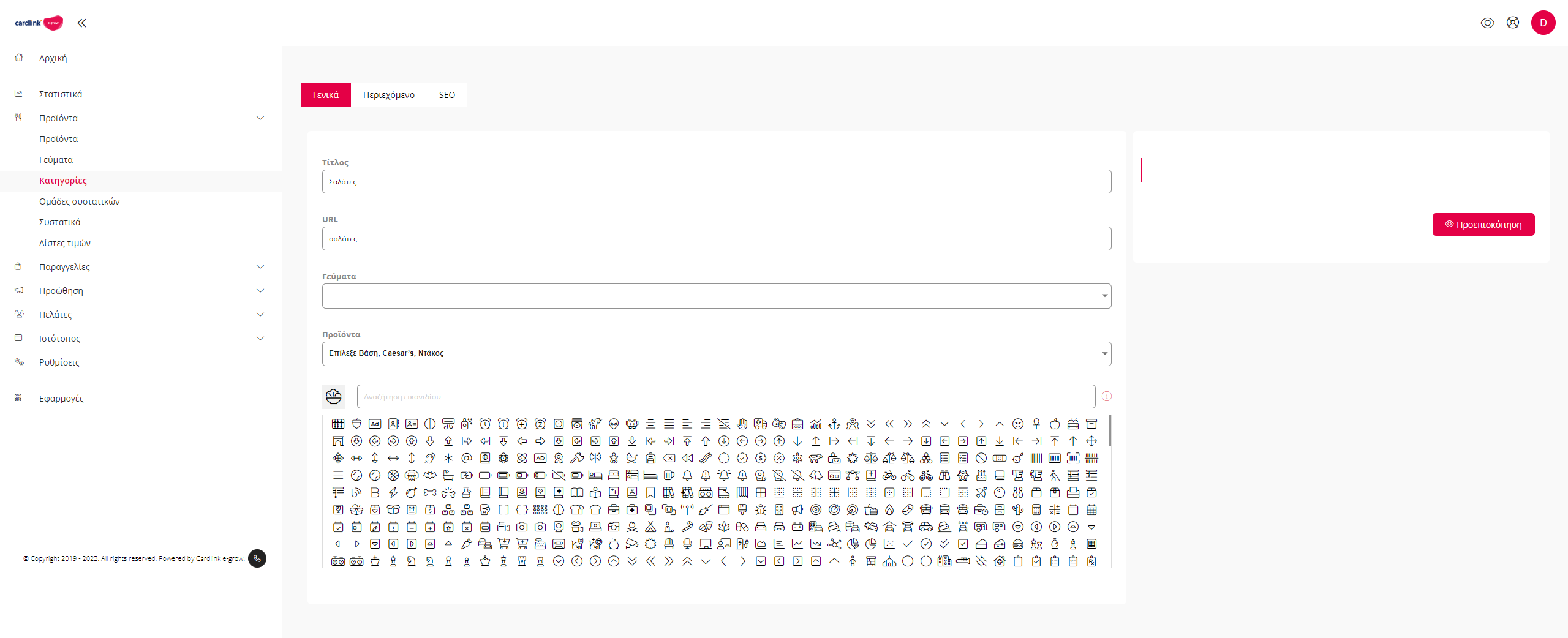 Κατά την επεξεργασία των κατηγοριών σας, μπορείτε επίσης να ορίσετε ένα εικονίδιο που θα τις συνοδεύει. Μπορείτε να επιλέξετε από μια λίστα με περισσότερα από 7.000 εικονίδια. Το Cardlink e-grow είναι ενσωματωμένο με τα εικονίδια Font Awesome και διαθέτει άδεια χρήσης εικονιδίων Free Pro που παρέχεται από το FontAwesome.