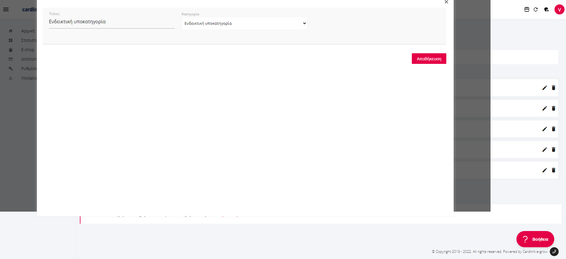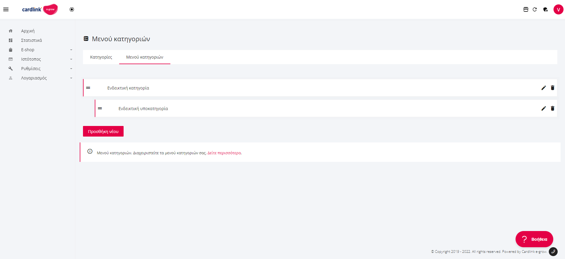 Το Cardlink e-grow σας επιτρέπει να δημιουργείτε πολλές κατηγορίες προϊόντων και να τις εκχωρείτε εύκολα στα προϊόντα σας. Για να δημιουργήσετε την πρώτη σας κατηγορία προϊόντων, επισκεφθείτε τον πίνακα διαχείρισης, επιλέξτε Κατηγορίες από το μενού ...