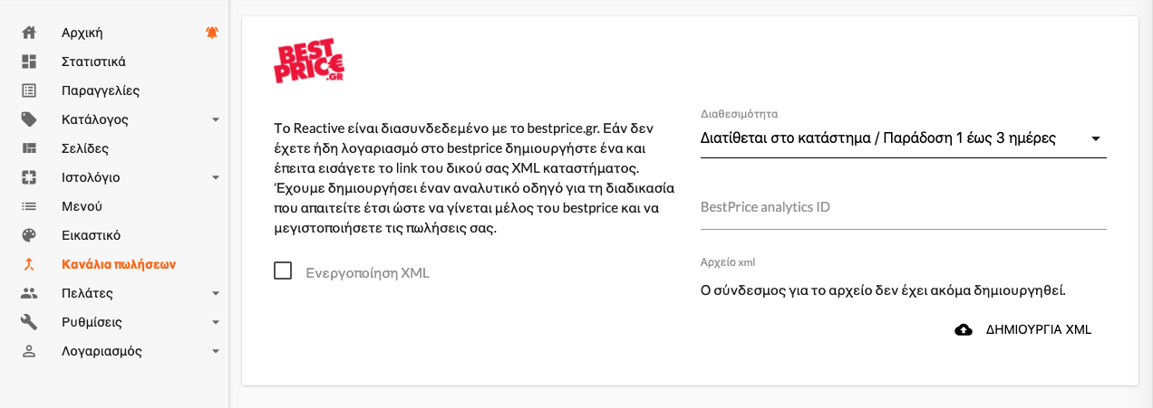 Πριν ξεκινήσετε να διαβάζετε αυτόν τον οδηγό, βεβαιωθείτε ότι έχετε ενεργοποιήσει το κανάλι πωλήσεων best price και έχετε δημιουργήσει το Αρχείο XML τουλάχιστον μία φορά. Για να το κάνετε αυτό, επισκεφθείτε την ενότητα Κανάλια πωλήσεων από το μενού Ρυθμίσεις του πίνακα διαχείρισης.